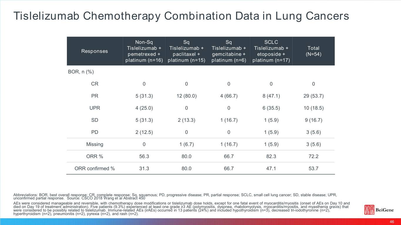 Tislelizumab Chemotherapy Combination Data in Lung Cancers Non-Sq Sq Sq SCLC Tislelizumab + Tislelizumab + Tislelizumab + Tislelizumab + Total Responses pemetrexed + paclitaxel + gemcitabine + etoposide + (N=54) platinum (n=16) platinum (n=15) platinum (n=6) platinum (n=17) BOR, n (%) CR 0 0 0 0 0 PR 5 (31.3) 12 (80.0) 4 (66.7) 8 (47.1) 29 (53.7) UPR 4 (25.0) 0 0 6 (35.5) 10 (18.5) SD 5 (31.3) 2 (13.3) 1 (16.7) 1 (5.9) 9 (16.7) PD 2 (12.5) 0 0 1 (5.9) 3 (5.6) Missing 0 1 (6.7) 1 (16.7) 1 (5.9) 3 (5.6) ORR % 56.3 80.0 66.7 82.3 72.2 ORR confirmed % 31.3 80.0 66.7 47.1 53.7 Abbreviations: BOR, best overall response; CR, complete response; Sq, squamous; PD, progressive disease; PR, partial response; SCLC, small cell lung cancer; SD, stable disease; UPR, unconfirmed partial response. Source: CSCO 2018 Wang et al Abstract 450 AEs were considered manageable and reversible, with chemotherapy dose modifications or tislelizumab dose holds, except for one fatal event of myocarditis/myositis (onset of AEs on Day 10 and died on Day 19 of treatment administration). Five patients (9.3%) experienced at least one grade ≥3 AE (polymyositis, dyspnea, rhabdomyolysis, myocarditis/myositis, and myasthenia gravis) that were considered to be possibly related to tislelizumab. Immune-related AEs (irAEs) occurred in 13 patients (24%) and included hypothyroidism (n=3), decreased tri-iodothyronine (n=2), hyperthyroidism (n=2), pneumonitis (n=2), pyrexia (n=2), and rash (n=2). 46