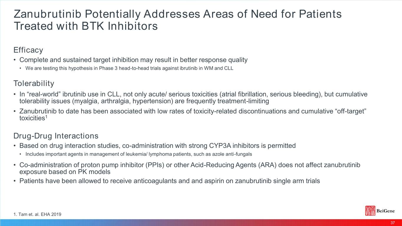 Ongoing Pivotal Study Phase 2 Zanubrutinib + Obinutuzumab vs Obinutuzumab in R/R FL Relapsed/Refractory FL (received ≥2 prior treatments*) Arm A Zanubrutinib 160 QD + Obinutuzumab X 6 cycles then q 8 wks until PD Grade 1, 2, or 3a FL (n = 140) patients R 2:1 (N=210) Arm B Obinutuzumab X 6 cycles then q 8 wks until PD (n = 70) Primary Endpoint: ORR CLL/SLL=chronic lymphocytic leukemia/small lymphocytic lymphoma, FL=follicular lymphoma, ORR=overall response rate, PD=progressive disease, PFS=progression-free survival, QD=once daily, R=randomization. *Must have received prior treatment with rituximab and an alkylator; relapsed <12 months from end of last treatment OR refractory to last treatment. This study is registered at ClinicalTrials.gov (NCT03332017). 36