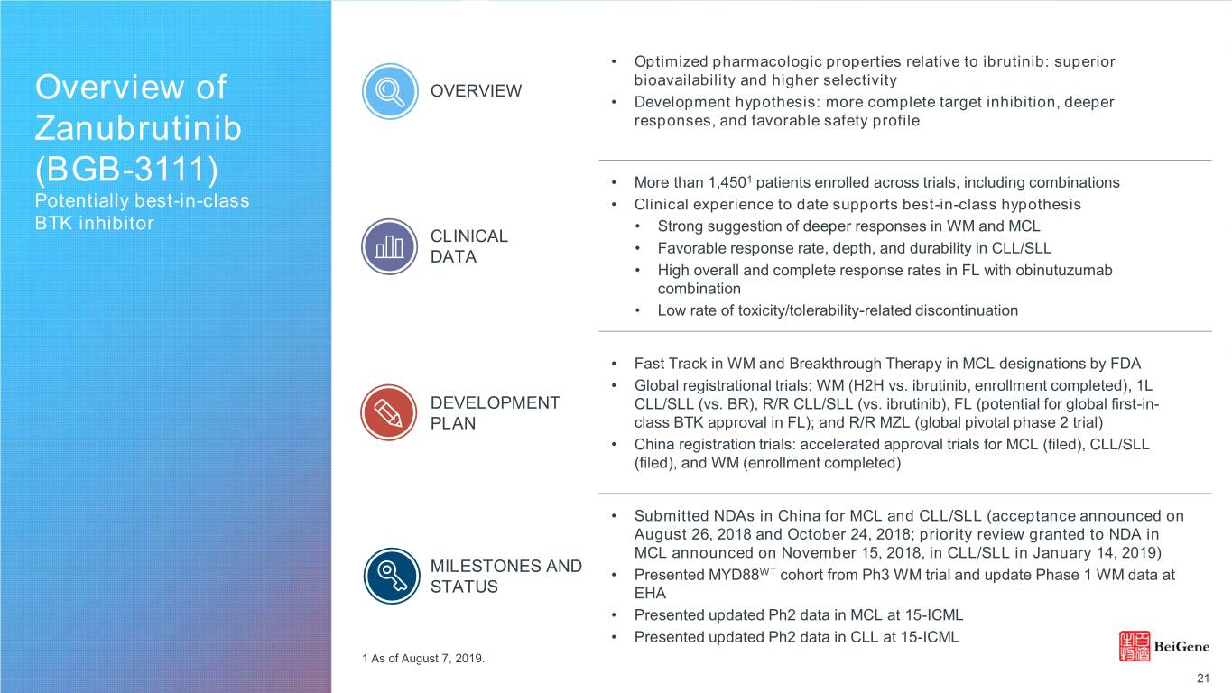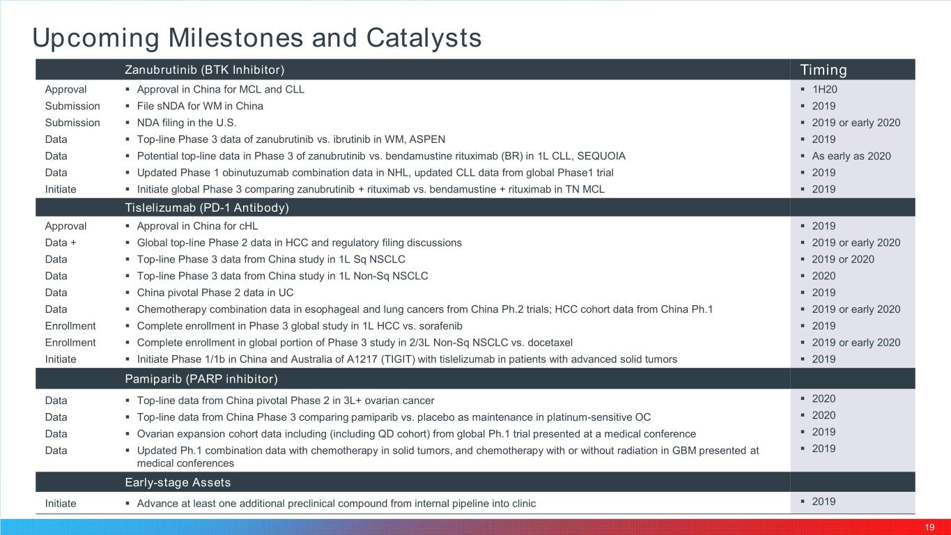 Upcoming Milestones and Catalysts Zanubrutinib (BTK Inhibitor) Timing Approval ▪ Approval in China for MCL and CLL ▪ 1H20 Submission ▪ File sNDA for WM in China ▪ 2019 Submission ▪ NDA filing in the U.S. ▪ 2019 or early 2020 Data ▪ Top-line Phase 3 data of zanubrutinib vs. ibrutinib in WM, ASPEN ▪ 2019 Data ▪ Potential top-line data in Phase 3 of zanubrutinib vs. bendamustine rituximab (BR) in 1L CLL, SEQUOIA ▪ As early as 2020 Data ▪ Updated Phase 1 obinutuzumab combination data in NHL, updated CLL data from global Phase1 trial ▪ 2019 Initiate ▪ Initiate global Phase 3 comparing zanubrutinib + rituximab vs. bendamustine + rituximab in TN MCL ▪ 2019 Tislelizumab (PD-1 Antibody) Approval ▪ Approval in China for cHL ▪ 2019 Data + ▪ Global top-line Phase 2 data in HCC and regulatory filing discussions ▪ 2019 or early 2020 Data ▪ Top-line Phase 3 data from China study in 1L Sq NSCLC ▪ 2019 or 2020 Data ▪ Top-line Phase 3 data from China study in 1L Non-Sq NSCLC ▪ 2020 Data ▪ China pivotal Phase 2 data in UC ▪ 2019 Data ▪ Chemotherapy combination data in esophageal and lung cancers from China Ph.2 trials; HCC cohort data from China Ph.1 ▪ 2019 or early 2020 Enrollment ▪ Complete enrollment in Phase 3 global study in 1L HCC vs. sorafenib ▪ 2019 Enrollment ▪ Complete enrollment in global portion of Phase 3 study in 2/3L Non-Sq NSCLC vs. docetaxel ▪ 2019 or early 2020 Initiate ▪ Initiate Phase 1/1b in China and Australia of A1217 (TIGIT) with tislelizumab in patients with advanced solid tumors ▪ 2019 Pamiparib (PARP inhibitor) Data ▪ Top-line data from China pivotal Phase 2 in 3L+ ovarian cancer ▪ 2020 Data ▪ Top-line data from China Phase 3 comparing pamiparib vs. placebo as maintenance in platinum-sensitive OC ▪ 2020 Data ▪ Ovarian expansion cohort data including (including QD cohort) from global Ph.1 trial presented at a medical conference ▪ 2019 Data ▪ Updated Ph.1 combination data with chemotherapy in solid tumors, and chemotherapy with or without radiation in GBM presented at ▪ 2019 medical conferences Early-stage Assets Initiate ▪ Advance at least one additional preclinical compound from internal pipeline into clinic ▪ 2019 19