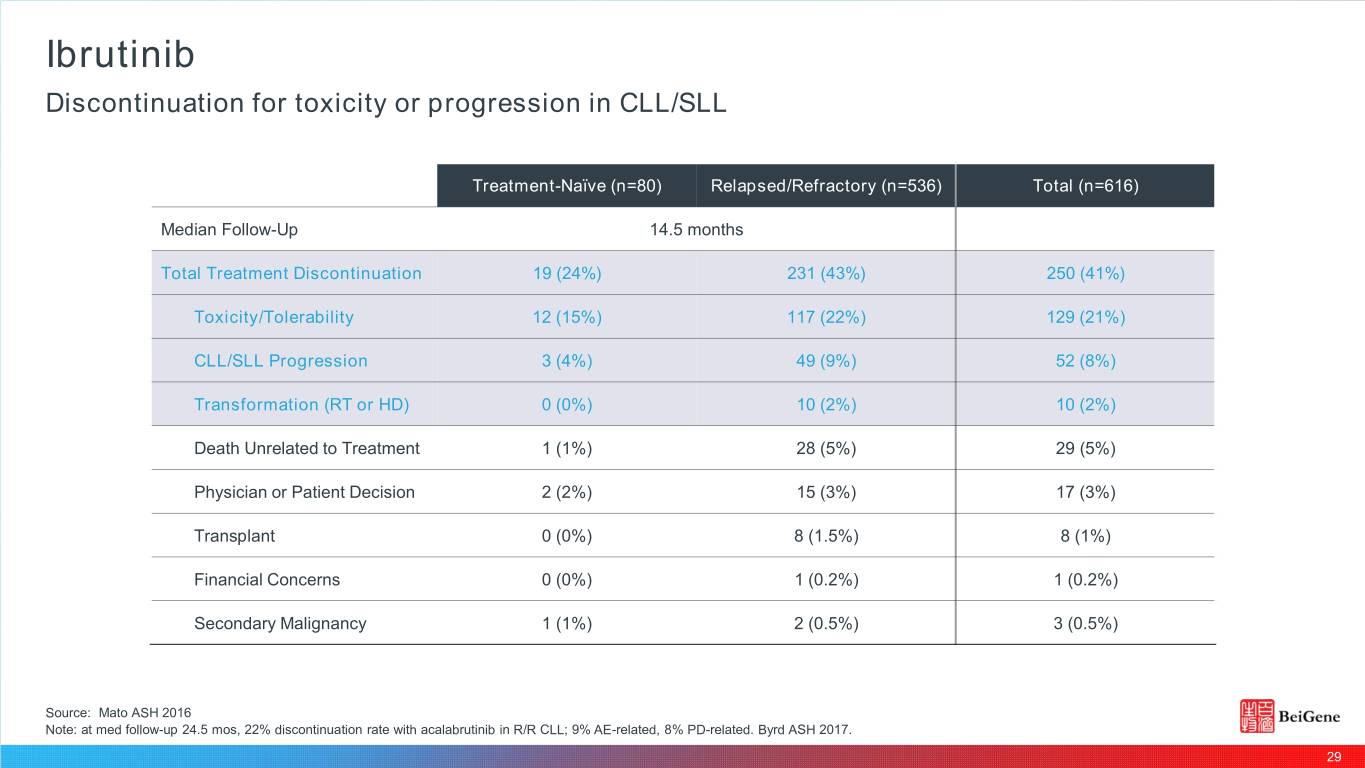 Ibrutinib Efficacy in CLL/SLL Overall Response Rate (Relapsed / Refractory) Progression Free Survival (Relapsed / Refractory) n 85 free - Median FU (mo) 20.9 Best Response ORR 75 (88%) CR 2 (2%) PR 58 (68%) Survival PR-L 15 (18%) SD NR PD NR Probability Progression of Probability Overall Response Rate (Treatment-Naïve) Progression Free Survival (Treatment-Naïve) n 136 free Median FU (mo) 18.4 - Best Response ORR 117 (86%) CR 5 (4%) PR 107 (79%) PR-L 5 (4%) Survival (%) SD NR PD NR Probability Progression of Probability Source: For TN, Burger, et al New Engl J Med 2015. For R/R, Byrd, et al New Engl J Med 2013 28