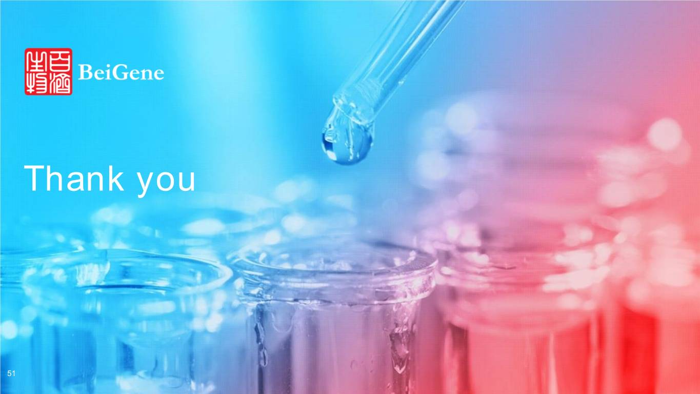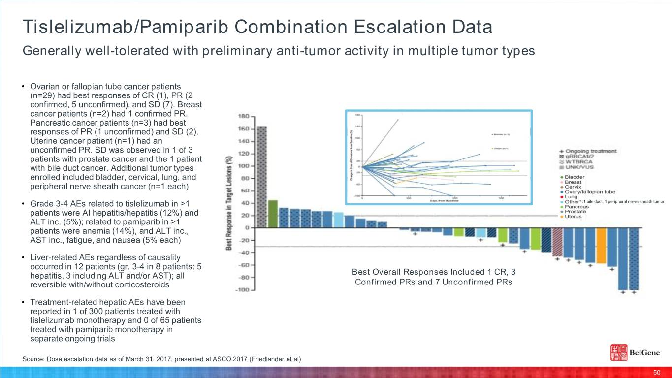 Tislelizumab/Pamiparib Combination Escalation Data Generally well-tolerated with preliminary anti-tumor activity in multiple tumor types • Ovarian or fallopian tube cancer patients (n=29) had best responses of CR (1), PR (2 confirmed, 5 unconfirmed), and SD (7). Breast cancer patients (n=2) had 1 confirmed PR. A. Change in Tumor Volume by Baseline Tumor Type Pancreatic cancer patients (n=3) had best responses of PR (1 unconfirmed) and SD (2). Uterine cancer patient (n=1) had an unconfirmed PR. SD was observed in 1 of 3 patients with prostate cancer and the 1 patient with bile duct cancer. Additional tumor types enrolled included bladder, cervical, lung, and peripheral nerve sheath cancer (n=1 each) • Grade 3-4 AEs related to tislelizumab in >1 :1 bile duct, 1 peripheral nerve sheath tumor patients were AI hepatitis/hepatitis (12%) and ALT inc. (5%); related to pamiparib in >1 patients were anemia (14%), and ALT inc., AST inc., fatigue, and nausea (5% each) • Liver-related AEs regardless of causality occurred in 12 patients (gr. 3-4 in 8 patients: 5 hepatitis, 3 including ALT and/or AST); all Best Overall Responses Included 1 CR, 3 reversible with/without corticosteroids Confirmed PRs and 7 Unconfirmed PRs • Treatment-related hepatic AEs have been reported in 1 of 300 patients treated with tislelizumab monotherapy and 0 of 65 patients treated with pamiparib monotherapy in separate ongoing trials Source: Dose escalation data as of March 31, 2017, presented at ASCO 2017 (Friedlander et al) 50