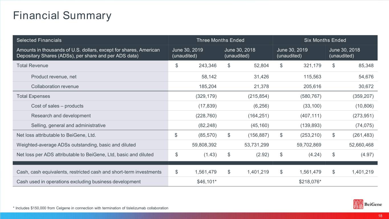 Financial Summary Selected Financials Three Months Ended Six Months Ended Amounts in thousands of U.S. dollars, except for shares, American June 30, 2019 June 30, 2018 June 30, 2019 June 30, 2018 Depositary Shares (ADSs), per share and per ADS data) (unaudited) (unaudited) (unaudited) (unaudited) Total Revenue $ 243,346 $ 52,804 $ 321,179 $ 85,348 Product revenue, net 58,142 31,426 115,563 54,676 Collaboration revenue 185,204 21,378 205,616 30,672 Total Expenses (329,179) (215,854) (580,767) (359,207) Cost of sales – products (17,839) (6,256) (33,100) (10,806) Research and development (228,760) (164,251) (407,111) (273,951) Selling, general and administrative (82,248) (45,160) (139,893) (74,075) Net loss attributable to BeiGene, Ltd. $ (85,570) $ (156,887) $ (253,210) $ (261,483) Weighted-average ADSs outstanding, basic and diluted 59,808,392 53,731,299 59,702,869 52,660,468 Net loss per ADS attributable to BeiGene, Ltd, basic and diluted $ (1.43) $ (2.92) $ (4.24) $ (4.97) Cash, cash equivalents, restricted cash and short-term investments $ 1,561,479 $ 1,401,219 $ 1,561,479 $ 1,401,219 Cash used in operations excluding business development $46,101* $218,076* * Includes $150,000 from Celgene in connection with termination of tislelizumab collaboration 18