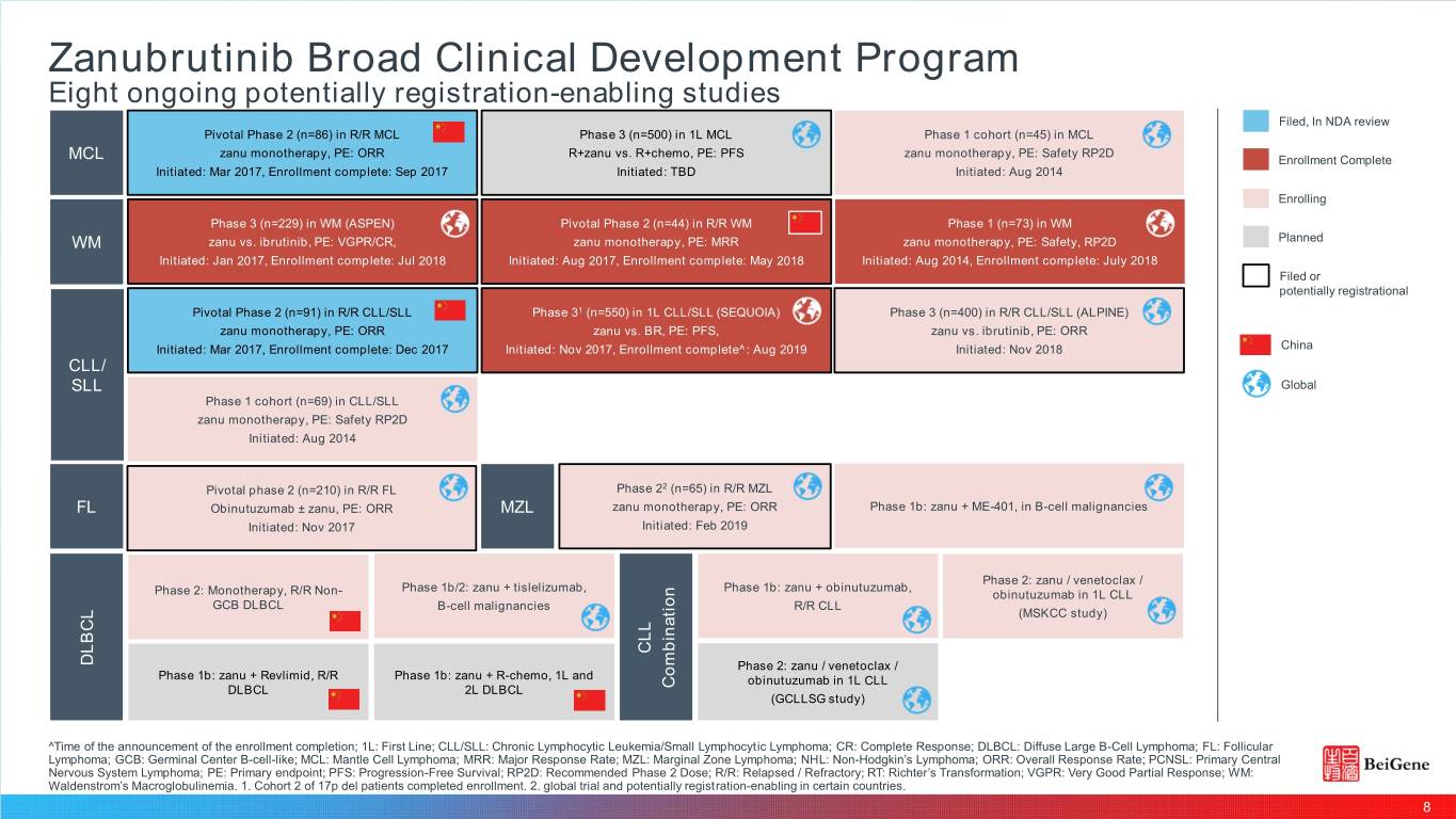 Two Late-Stage Assets Represent Significant Commercial Opportunities zanubrutinib tislelizumab Potentially Best-in-Class BTK Inhibitor PD-1 Inhibitor Targeting Asia-Prevalent Tumors ▪ 2018 Global: $4.2 Bn ▪ 2018 Global^: $15.5 Bn CLASS REVENUE & FORECAST** ▪ 2025E Global: $13.8 Bn ▪ 2025E Global^: $57.4 Bn ▪ 2025E China: $1.3 Bn ▪ 2025E China^: $12.1 Bn KEY TARGET Chronic Lymphocytic Leukemia/Small Lymphocytic Lymphoma, Waldenstrom’s Lung, liver, gastric, and esophageal cancers, classical INDICATIONS Macroglobulinemia, Mantle Cell Lymphoma, Follicular Lymphoma, Marginal Zone Lymphoma Hodgkin’s lymphoma, urothelial carcinoma, nasopharyngeal 70-patient China pivotal 104-patient China pivotal 86-patient R/R MCL1 73-patient WM2 91-patient R/R CLL/SLL3 Ph2 R/R cHL4 Ph2 2L+ UC5 CLINICAL DATA* ▪ 84% ORR ▪ 92% ORR, 82% MRR ▪ 85% ORR ▪ 87% ORR ▪ 23% ORR ▪ 59% CR ▪ 41% VGPR ▪ 5% CR ▪ 63% CR ▪ 8% CR ▪ NDAs for R/R MCL and R/R CLL/SLL accepted by NMPA ▪ NDAs for cHL and UC in China accepted by NMPA FILING PROGRESS ▪ Priority review status granted to NDAs in R/R MCL and R/R CLL/SLL ▪ Priority review granted by NMPA ▪ Fast Track in WM and Breakthrough Therapy in MCL by U.S. FDA 1. ICML 2019 Song et. al.; 2. EHA 2019 Trotman et. al.; 3. ICML 2019 Xu et. al.; 4. EHA 2019 Song et. al. 5. China pivotal Phase 2 trial, BeiGene press release May 30, 2019. *All data are from independent review committee (IRC) assessment. **Frost&Sullivan analysis; RMB:USD conversion: 6.5:1. ^For PD-1 & PD-L1 class; BTK: Bruton’s Tyrosine Kinase; cHL: Classical Hodgkin’s Lymphoma; CLL/SLL: Chronic Lymphocytic Leukemia/Small Lymphocytic Lymphoma; CR: Complete Response; FL: Follicular Lymphoma; f/u: Median follow up time; MCL: Mantle Cell Lymphoma; MZL: Marginal Zone Lymphoma; MRR: Major Response Rate; NDA: New Drug Application; NMPA: National Medical Products Administration; ORR: Overall Response Rate; PD-1: Programmed Cell Death-1; R/R: Relapsed/Refractory; UC: Urothelial Carcinoma; VGPR: Very Good Partial Response; WM: Waldenstrom’s Macroglobulinemia; R/R: Relapsed / Refractory. 7