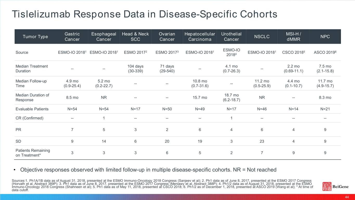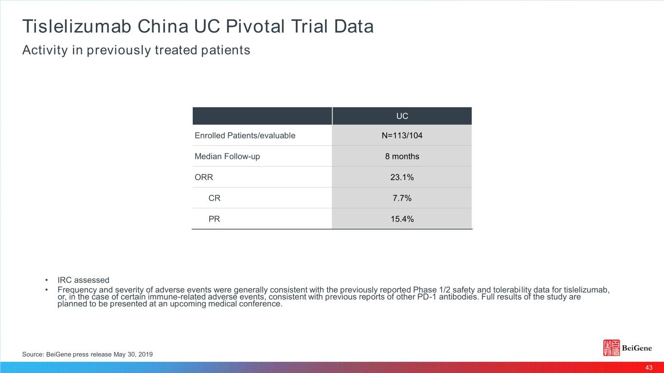 Tislelizumab China UC Pivotal Trial Data Activity in previously treated patients UC Enrolled Patients/evaluable N=113/104 Median Follow-up 8 months ORR 23.1% CR 7.7% PR 15.4% • IRC assessed • Frequency and severity of adverse events were generally consistent with the previously reported Phase 1/2 safety and tolerability data for tislelizumab, or, in the case of certain immune-related adverse events, consistent with previous reports of other PD-1 antibodies. Full results of the study are planned to be presented at an upcoming medical conference. Source: BeiGene press release May 30, 2019 43