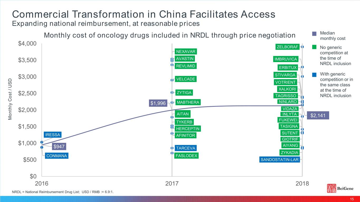 Commercial Transformation in China Facilitates Access Expanding national reimbursement, at reasonable prices Median Monthly cost of oncology drugs included in NRDL through price negotiation monthly cost $4,000 ZELBORAF No generic NEXAVAR competition at $3,500 AVASTIN IMBRUVICA the time of NRDL inclusion REVLIMID ERBITUX STIVARGA With generic $3,000 VELCADE competition or in VOTRIENT the same class XALKORI at the time of ZYTIGA $2,500 TAGRISSO NRDL inclusion $1,996 MABTHERA NINLARO $2,000 VIDAZA AITAN INLYTA $2,141 Monthly USD Cost/ Monthly FUKEWEI TYKERB TASIGNA $1,500 HERCEPTIN SUTENT IRESSA AFINITOR GIOTRIF $1,000 AIYANG $947 TARCEVA ZYKADIA CONMANA FASLODEX $500 SANDOSTATIN-LAR $0 2016 2017 2018 NRDL = National Reimbursement Drug List; USD / RMB := 6.9:1. 15