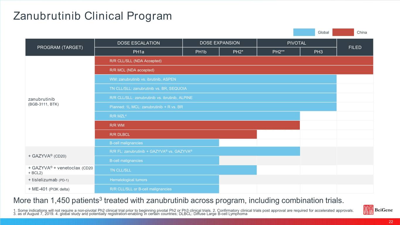 • Optimized pharmacologic properties relative to ibrutinib: superior bioavailability and higher selectivity OVERVIEW Overview of • Development hypothesis: more complete target inhibition, deeper Zanubrutinib responses, and favorable safety profile (BGB-3111) • More than 1,4501 patients enrolled across trials, including combinations Potentially best-in-class • Clinical experience to date supports best-in-class hypothesis BTK inhibitor • Strong suggestion of deeper responses in WM and MCL CLINICAL • Favorable response rate, depth, and durability in CLL/SLL DATA • High overall and complete response rates in FL with obinutuzumab combination • Low rate of toxicity/tolerability-related discontinuation • Fast Track in WM and Breakthrough Therapy in MCL designations by FDA • Global registrational trials: WM (H2H vs. ibrutinib, enrollment completed), 1L DEVELOPMENT CLL/SLL (vs. BR), R/R CLL/SLL (vs. ibrutinib), FL (potential for global first-in- PLAN class BTK approval in FL); and R/R MZL (global pivotal phase 2 trial) • China registration trials: accelerated approval trials for MCL (filed), CLL/SLL (filed), and WM (enrollment completed) • Submitted NDAs in China for MCL and CLL/SLL (acceptance announced on August 26, 2018 and October 24, 2018; priority review granted to NDA in MCL announced on November 15, 2018, in CLL/SLL in January 14, 2019) MILESTONES AND • Presented MYD88WT cohort from Ph3 WM trial and update Phase 1 WM data at STATUS EHA • Presented updated Ph2 data in MCL at 15-ICML • Presented updated Ph2 data in CLL at 15-ICML 1 As of August 7, 2019. 21
