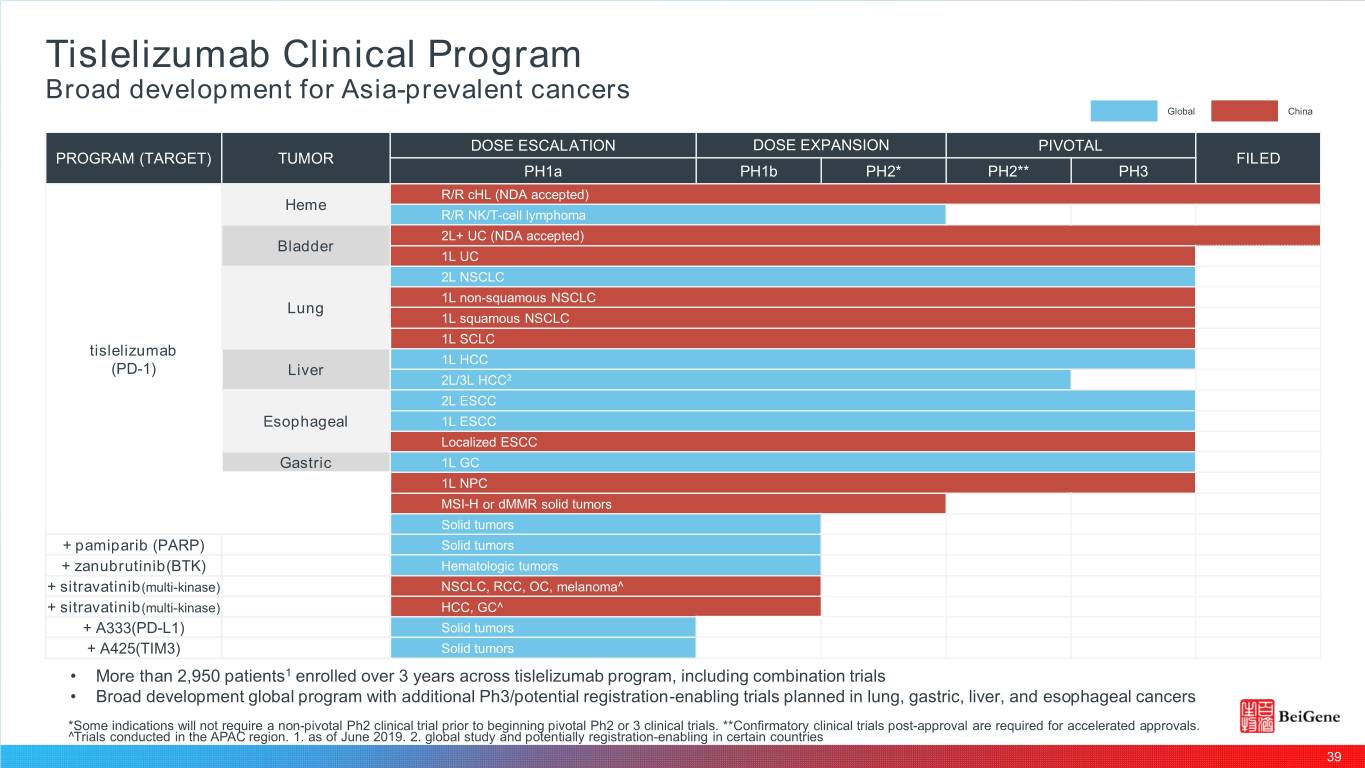 • Tislelizumab is a PD-1 checkpoint inhibitor with distinct molecular structure and an engineered Fc region; believed to minimize potentially negative interactions with other immune cells1 Overview of • Pivotal data in lead indication: 87% ORR (63% CR) in R/R cHL • Broad development in Asia-prevalent cancers Tislelizumab • 14 ongoing and soon-to-start Ph. 3 or potentially registration-enabling trials: 4 in lung OVERVIEW cancer, 2 in liver cancer, 3 in esophageal cancer, 1 in gastric cancer, 2 in bladder (BGB-A317) cancer, 1 in nasopharyngeal cancer, and 1 in MSI-H or dMMR solid tumors Broad integrated global and • Aimed to support broad label and label-based reimbursement China development program • Strong manufacturing capabilities with emphasis on quality • Manufacturing process and initial capacity developed by Boehringer Ingelheim • BeiGene’s state-of-the-art 24,000L facility in Guangzhou expected to become operational in 2019 CLINICAL • Clinical experience in more than 2,950 patients2 enrolled over 3 years has DATA demonstrated encouraging clinical activity and generally well-tolerated safety profile • Broad development program designed to capture worldwide commercial opportunities • Two China accelerated approval trials : cHL (priority) and urothelial cancer (priority) DEVELOPMENT • Initiated global Ph2 trials in NK/T cell lymphomas and 2L/3L HCC, China pivotal Ph2 in MSI-H or dMMR solid tumors, 5 global Ph3 trials in 1L GC, 1L and 2L ESCC, 1L HCC PLAN and 2L NSCLC; 6 Ph3 trials in 1L non-sq and sq NSCLC, 1L SCLC, 1L UC, localized ESCC and 1L NPC in China • Combinations ongoing with BeiGene’s PARP, BTK, PD-L1 and TIM3 inhibitors • Additional Ph3 trials planned • Submitted first NDA in China for cHL (priority review granted November 15, 2018) and sNDA for UC (priority review announced July 8, 2019) MILESTONES AND • Presented data on long term exposure and structure/mechanism at AACR 2019 STATUS • Presented data on use in NPC at ASCO 2019 • Presented China cHL pivotal trial data at EHA 2019 Source: 1. Dahan et al., Cancer Cell, 2015; Arlauckas et al., Sci. Transl. Med., 2017; 2. as of June 20, 2019 38