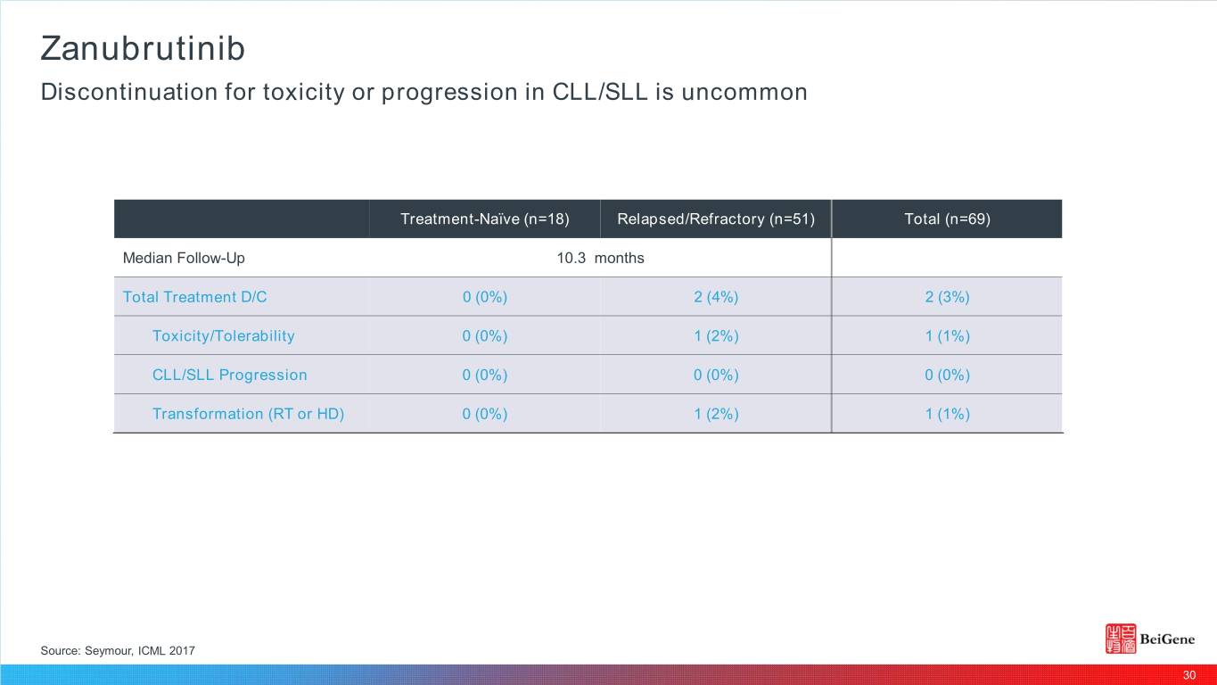 Ibrutinib Discontinuation for toxicity or progression in CLL/SLL Treatment-Naïve (n=80) Relapsed/Refractory (n=536) Total (n=616) Median Follow-Up 14.5 months Total Treatment Discontinuation 19 (24%) 231 (43%) 250 (41%) Toxicity/Tolerability 12 (15%) 117 (22%) 129 (21%) CLL/SLL Progression 3 (4%) 49 (9%) 52 (8%) Transformation (RT or HD) 0 (0%) 10 (2%) 10 (2%) Death Unrelated to Treatment 1 (1%) 28 (5%) 29 (5%) Physician or Patient Decision 2 (2%) 15 (3%) 17 (3%) Transplant 0 (0%) 8 (1.5%) 8 (1%) Financial Concerns 0 (0%) 1 (0.2%) 1 (0.2%) Secondary Malignancy 1 (1%) 2 (0.5%) 3 (0.5%) Source: Mato ASH 2016 Note: at med follow-up 24.5 mos, 22% discontinuation rate with acalabrutinib in R/R CLL; 9% AE-related, 8% PD-related. Byrd ASH 2017. 29
