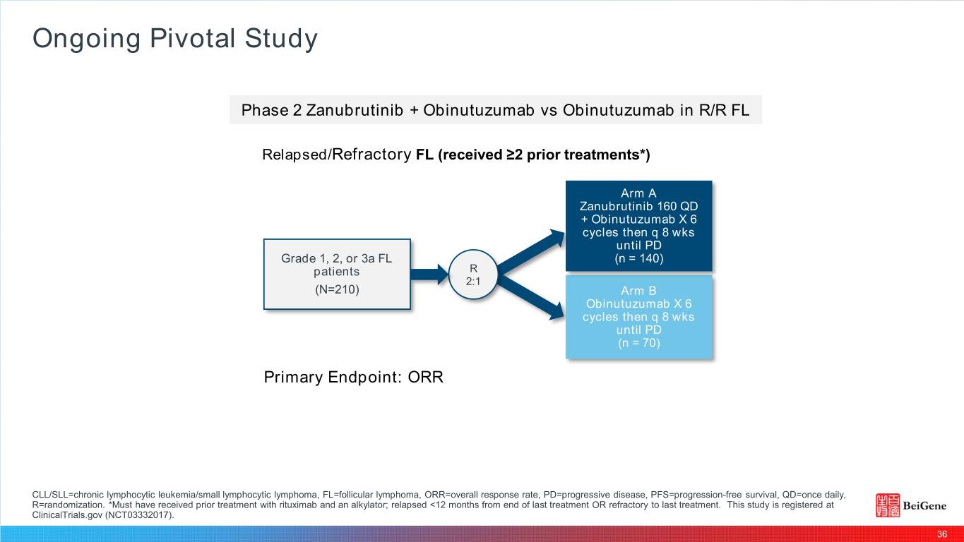 Ongoing Global Phase 3 Studies SEQUOIA and ALPINE Zanubrutinib vs. BR in 1L CLL/SLL Phase 3 Zanubrutinib Vs Ibrutinib in R/R CLL/SLL Cohort 1: Non–17p del TN CLL Arm A Must be not suitable for FCR Zanubrutinib Relapsed/Refractory CLL/SLL 160 mg BID until PD Arm A Previously (received ≥ 1 prior treatments) untreated R Zanubrutinib CLL patients 1:1 160mg BID (N=420) (n = 200) Arm B R/R CLL/SLL ≥ 1 prior Bendamustine Primary endpoint: PFS treatment R + Rituximab (BR) 1:1 × 6 cycles (N=400) Arm B Ibrutinib 420mg QD Cohort 2: 17p del TN CLL (n = 200) Previously untreated Arm C Primary Endpoint: ORR (non-inferiority and superiority) 17p del CLL patients Zanubrutinib (N=110) 160 mg BID until PD 1L=first-line treatment, BID=twice daily, CLL=chronic lymphocytic leukemia, del=deleted, FCR=fludarabine, cyclophosphamide, and rituximab, ORR=overall response rate, PD=progressive disease, PFS=progression-free survival, QD=once daily, R=randomized, SLL=small lymphocytic lymphoma, TN=treatment naïve. These studies are registered at ClinicalTrials.gov (NCT03734016) and (NCT03336333). 35