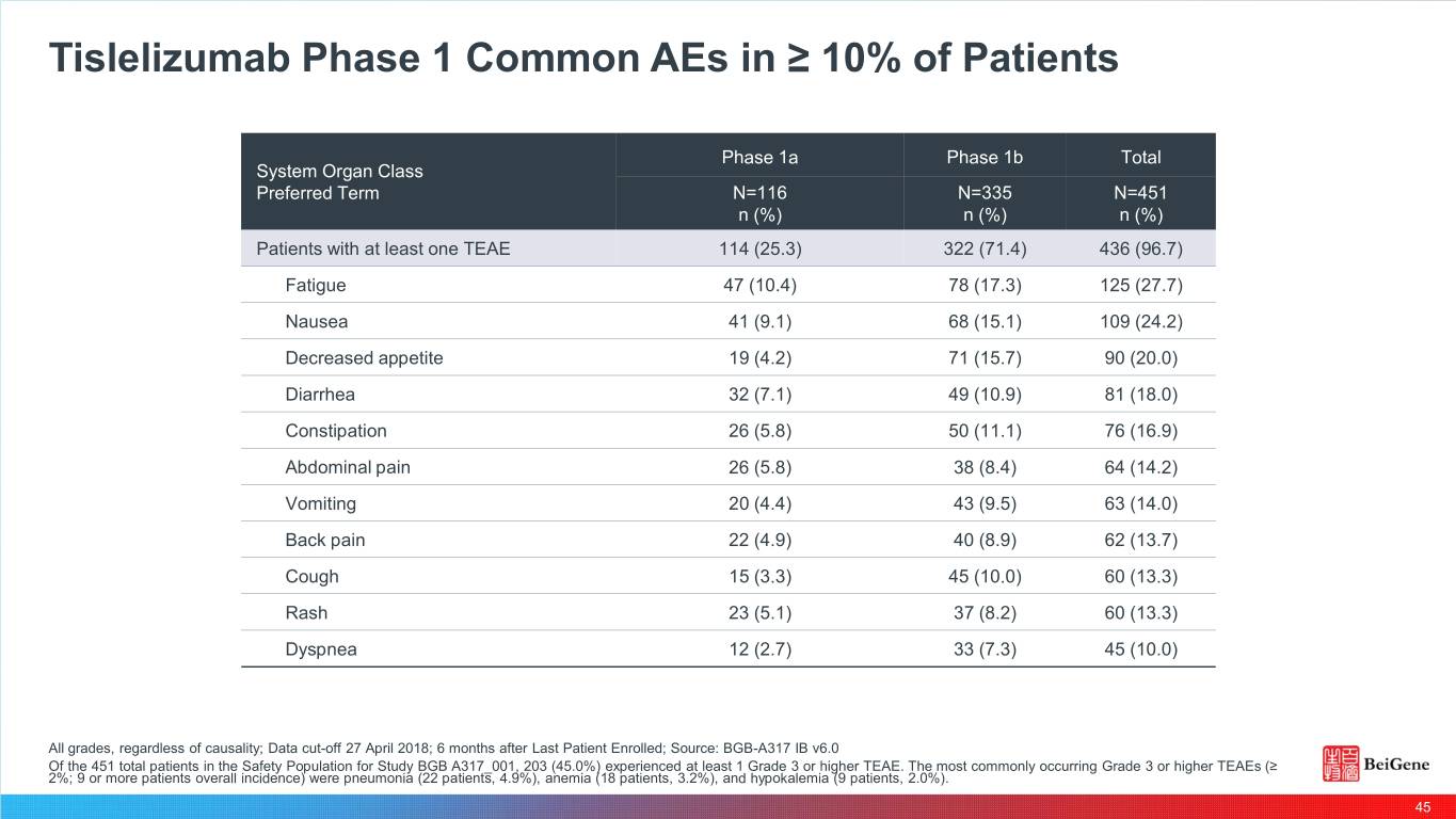 Tislelizumab Phase 1 Common AEs in ≥ 10% of Patients Phase 1a Phase 1b Total System Organ Class Preferred Term N=116 N=335 N=451 n (%) n (%) n (%) Patients with at least one TEAE 114 (25.3) 322 (71.4) 436 (96.7) Fatigue 47 (10.4) 78 (17.3) 125 (27.7) Nausea 41 (9.1) 68 (15.1) 109 (24.2) Decreased appetite 19 (4.2) 71 (15.7) 90 (20.0) Diarrhea 32 (7.1) 49 (10.9) 81 (18.0) Constipation 26 (5.8) 50 (11.1) 76 (16.9) Abdominal pain 26 (5.8) 38 (8.4) 64 (14.2) Vomiting 20 (4.4) 43 (9.5) 63 (14.0) Back pain 22 (4.9) 40 (8.9) 62 (13.7) Cough 15 (3.3) 45 (10.0) 60 (13.3) Rash 23 (5.1) 37 (8.2) 60 (13.3) Dyspnea 12 (2.7) 33 (7.3) 45 (10.0) All grades, regardless of causality; Data cut-off 27 April 2018; 6 months after Last Patient Enrolled; Source: BGB-A317 IB v6.0 Of the 451 total patients in the Safety Population for Study BGB A317_001, 203 (45.0%) experienced at least 1 Grade 3 or higher TEAE. The most commonly occurring Grade 3 or higher TEAEs (≥ 2%; 9 or more patients overall incidence) were pneumonia (22 patients, 4.9%), anemia (18 patients, 3.2%), and hypokalemia (9 patients, 2.0%). 45