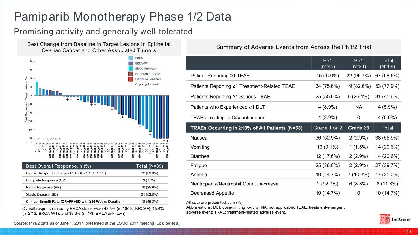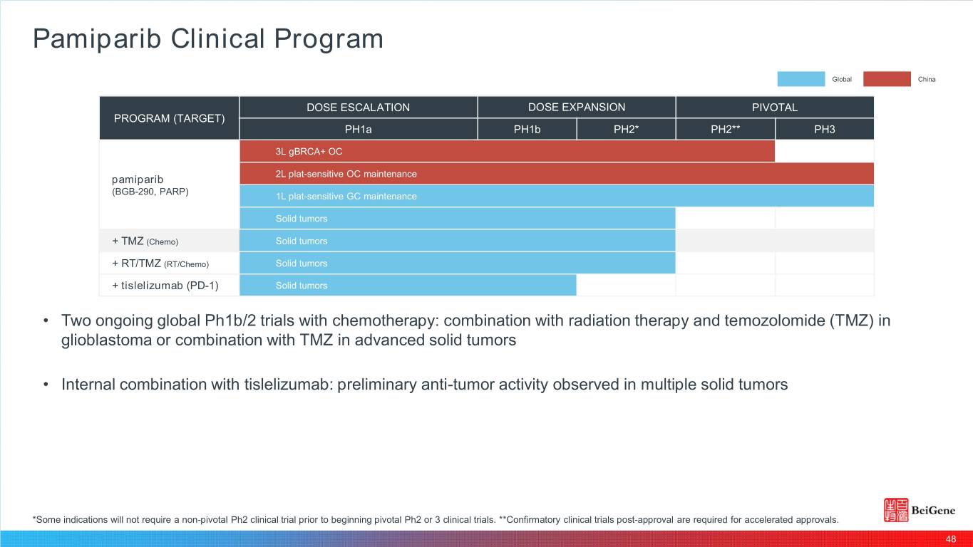 Pamiparib Clinical Program Global China DOSE ESCALATION DOSE EXPANSION PIVOTAL PROGRAM (TARGET) PH1a PH1b PH2* PH2** PH3 3L gBRCA+ OC 2L plat-sensitive OC maintenance pamiparib (BGB-290, PARP) 1L plat-sensitive GC maintenance Solid tumors + TMZ (Chemo) Solid tumors + RT/TMZ (RT/Chemo) Solid tumors + tislelizumab (PD-1) Solid tumors • Two ongoing global Ph1b/2 trials with chemotherapy: combination with radiation therapy and temozolomide (TMZ) in glioblastoma or combination with TMZ in advanced solid tumors • Internal combination with tislelizumab: preliminary anti-tumor activity observed in multiple solid tumors *Some indications will not require a non-pivotal Ph2 clinical trial prior to beginning pivotal Ph2 or 3 clinical trials. **Confirmatory clinical trials post-approval are required for accelerated approvals. 48