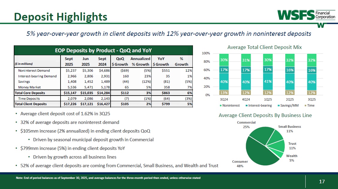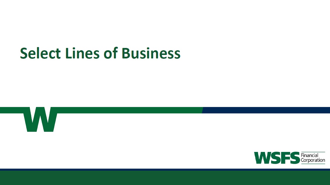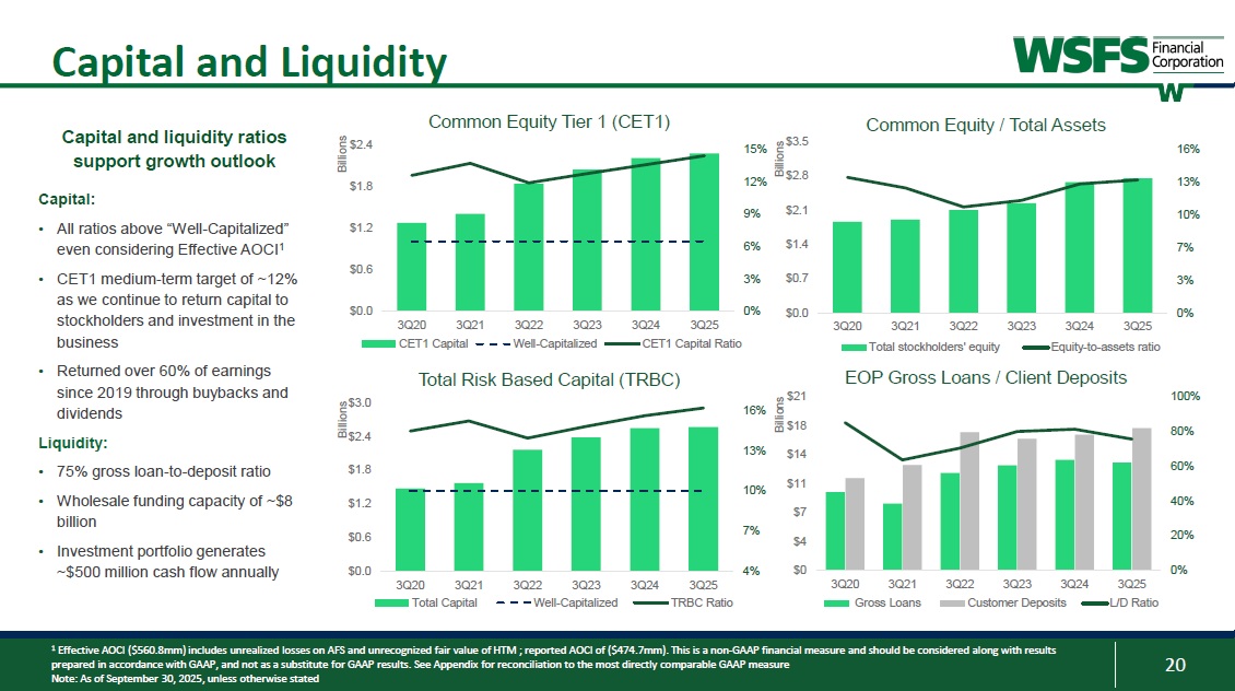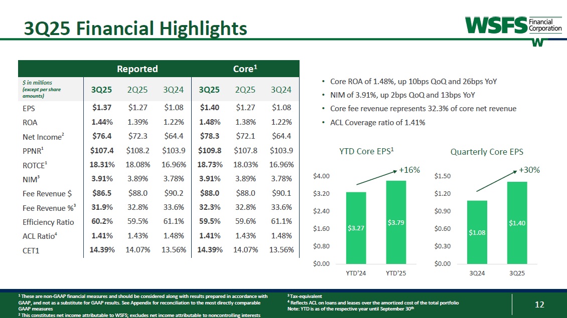 12 $ 3.27 $ 3.79 + 16% $ 1.50 $ 4.00 $ 1.20 $ 3.20 $ 0.90 $ 2.40 $ 0.00 $ 0.80 $ 1.60 YTD‘24 YTD’25 YTD核心EPS 1 3Q25财务亮点1这些是非GAAP财务指标,应与根据GAAP编制的结果一起考虑,而不是作为GAAP结果的替代。与最直接可比的公认会计原则措施2的对账情况见附录,这构成归属于WSFS的净利润;不包括归属于非控股权益的净利润3税项相当于4反映了贷款的ACL和租赁超过总投资组合的摊销成本注:年初至今为截至各自年度截至9月30日Core 1报告3Q24 2Q25 3Q25 3Q24 2Q25 3Q25百万美元(每股金额除外)$ 1.08 $ 1.27 $ 1.40 $ 1.08 $ 1.27 $ 1.37 EPS 1.22% 1.38% 1.48% 1.22% 1.39% 1.44% ROA $ 64.4 $ 72.1 $ 78.3 $ 64.4 $ 72.3 $ 76.4净收入2 $ 103.9 $ 107.8 $ 109.8 $ 103.9 $ 108.2 $ 107.4 PPNR1 16.96% 18.03% 18.73% 16.96% 18.08% 18.31% ROTCE 13.78% 3.89% 3.91% 3.78% 3.89% 3.91% NIM 3 $ 90.1 $ 88.0 $ 88.0 $ 90.2 $ 88.0 $ 86.5费用收入$ 33.6% 32.8% 32.3% 33.6% 32.8% 31.9ACL比率413.56% 14.07% 14.39% 13.56% 14.07% 14.39% CET1 $ 1.08 $ 1.40 $ 0.00 $ 0.30 $ 0.60 3Q24 3Q25季度核心EPS •核心ROA为1.48%,环比上升10bps,同比上升26bps • NIM为3.91%,环比上升2bps,同比上升13bps •核心费用收入占核心净收入的32.3% • ACL覆盖率为1.41% + 30%