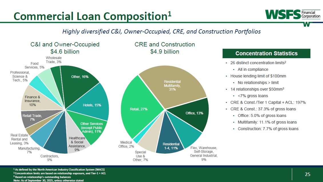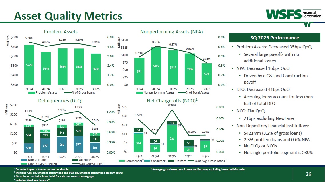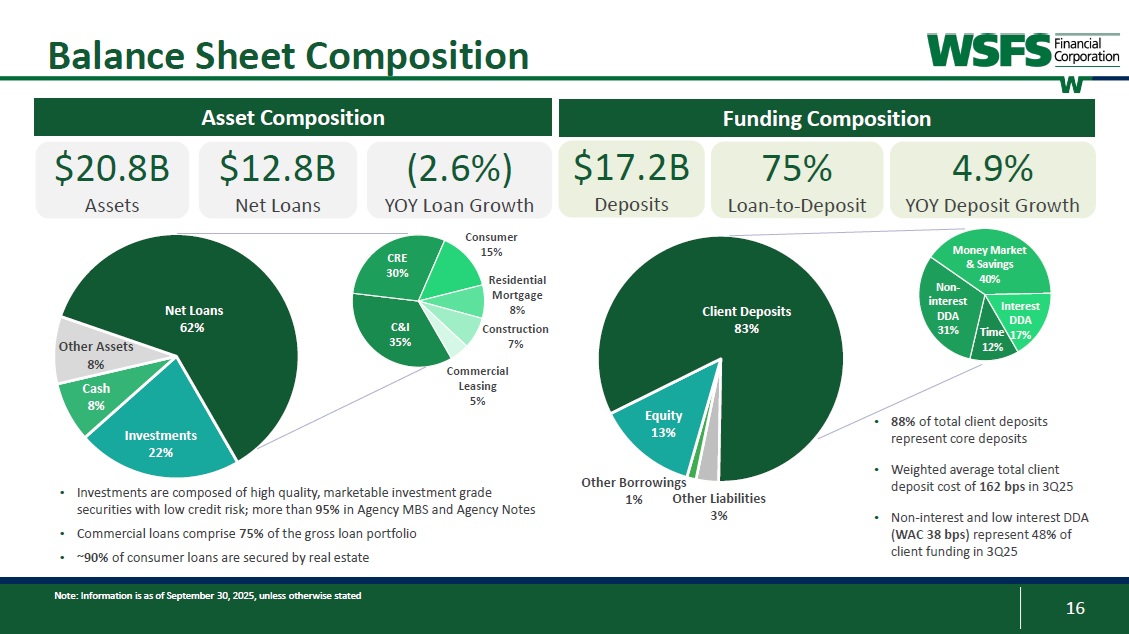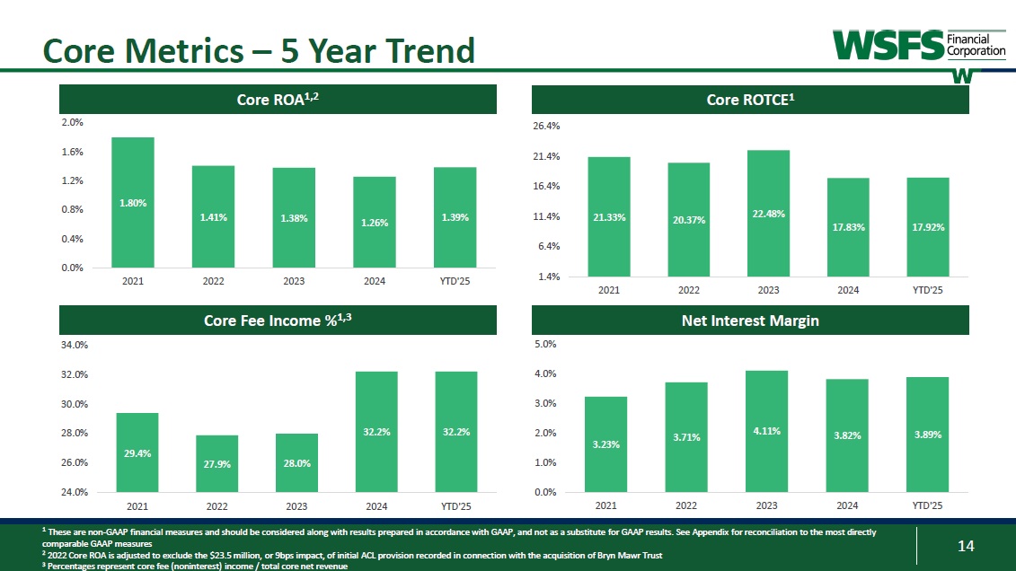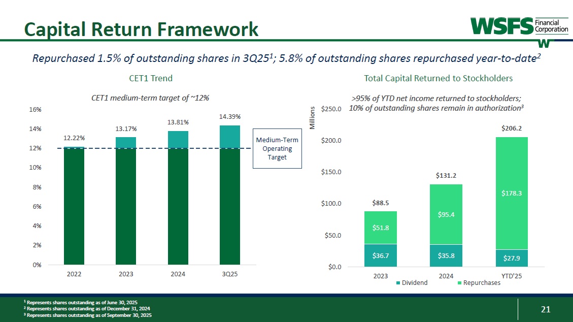 12 $ 3.27 $ 3.79 + 16% $ 1.50 $ 4.00 $ 1.20 $ 3.20 $ 0.90 $ 2.40 $ 0.00 $ 0.80 $ 1.60 YTD‘24 YTD’25 YTD核心EPS 1 3Q25财务亮点1这些是非GAAP财务指标,应与根据GAAP编制的结果一起考虑,而不是作为GAAP结果的替代。与最直接可比的公认会计原则措施2的对账情况见附录,这构成归属于WSFS的净利润;不包括归属于非控股权益的净利润3税项相当于4反映了贷款的ACL和租赁超过总投资组合的摊销成本注:年初至今为截至各自年度截至9月30日Core 1报告3Q24 2Q25 3Q25 3Q24 2Q25 3Q25百万美元(每股金额除外)$ 1.08 $ 1.27 $ 1.40 $ 1.08 $ 1.27 $ 1.37 EPS 1.22% 1.38% 1.48% 1.22% 1.39% 1.44% ROA $ 64.4 $ 72.1 $ 78.3 $ 64.4 $ 72.3 $ 76.4净收入2 $ 103.9 $ 107.8 $ 109.8 $ 103.9 $ 108.2 $ 107.4 PPNR1 16.96% 18.03% 18.73% 16.96% 18.08% 18.31% ROTCE 13.78% 3.89% 3.91% 3.78% 3.89% 3.91% NIM 3 $ 90.1 $ 88.0 $ 88.0 $ 90.2 $ 88.0 $ 86.5费用收入$ 33.6% 32.8% 32.3% 33.6% 32.8% 31.9ACL比率413.56% 14.07% 14.39% 13.56% 14.07% 14.39% CET1 $ 1.08 $ 1.40 $ 0.00 $ 0.30 $ 0.60 3Q24 3Q25季度核心EPS •核心ROA为1.48%,环比上升10bps,同比上升26bps • NIM为3.91%,环比上升2bps,同比上升13bps •核心费用收入占核心净收入的32.3% • ACL覆盖率为1.41% + 30%