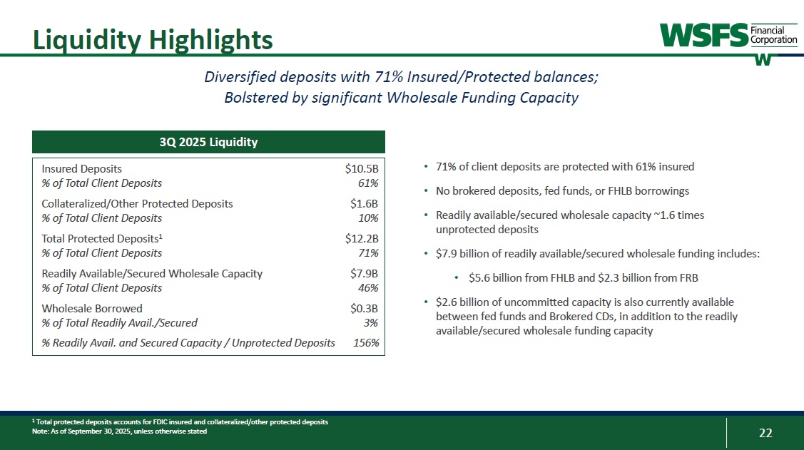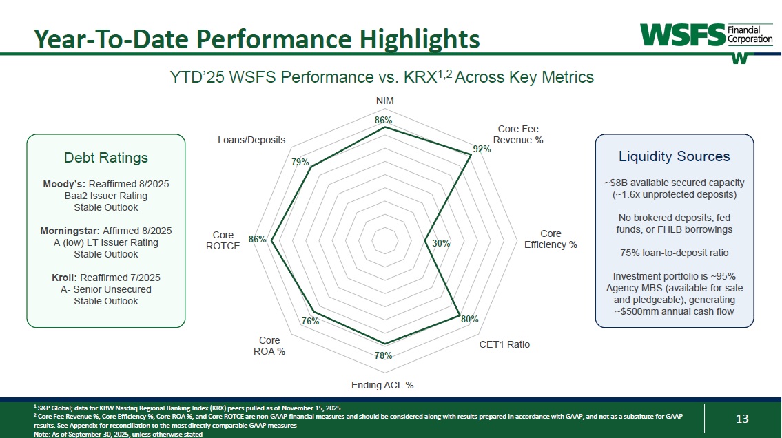 13年迄今业绩亮点1 标普全球;截至2025年11月15日KBW 纳斯达克区域银行指数(KRX)同行的数据拉动2核心费用收入%、核心效率%、核心ROA %和核心ROTCE为非GAAP财务指标,应与根据GAAP编制的结果一起考虑,而不是作为GAAP结果的替代。与最直接可比的GAAP措施的对账情况见附录注:截至2025年9月30日,除非另有说明,核心效率% CET1比率期末ACL %核心ROA %核心ROTCE 92% 79% 78% 76% 86% 30% 80%年初至今’25年的WSFS表现与KRX 1,2在关键指标上的NIM86 %核心费用贷款/存款收入%债务评级穆迪:重申8/2025 Baa2发行人评级稳定展望AAA Morningstar:确认8/2025 A(低)LTT发行人评级稳定展望Kroll:重申7/2025 A-高级无抵押稳定展望流动性来源~$ 8B可用有担保能力(~1.6x无保护存款)无经纪存款,联邦基金,或FHLB借款75%贷存比投资组合为~95%代理MBS(可供出售和可质押),每年产生~500mm的现金流