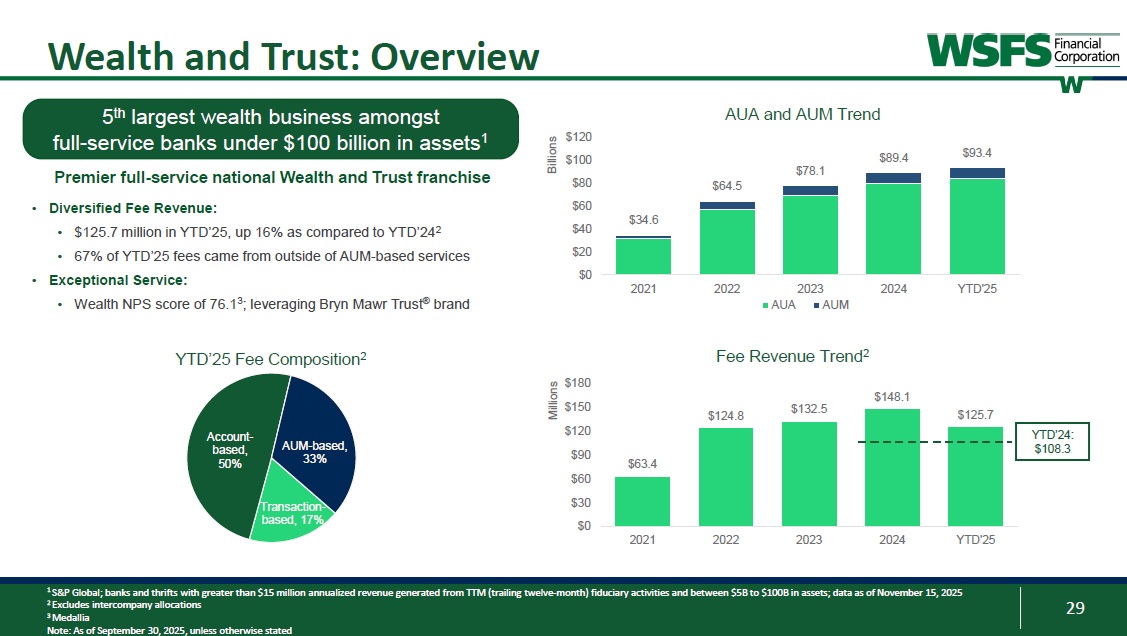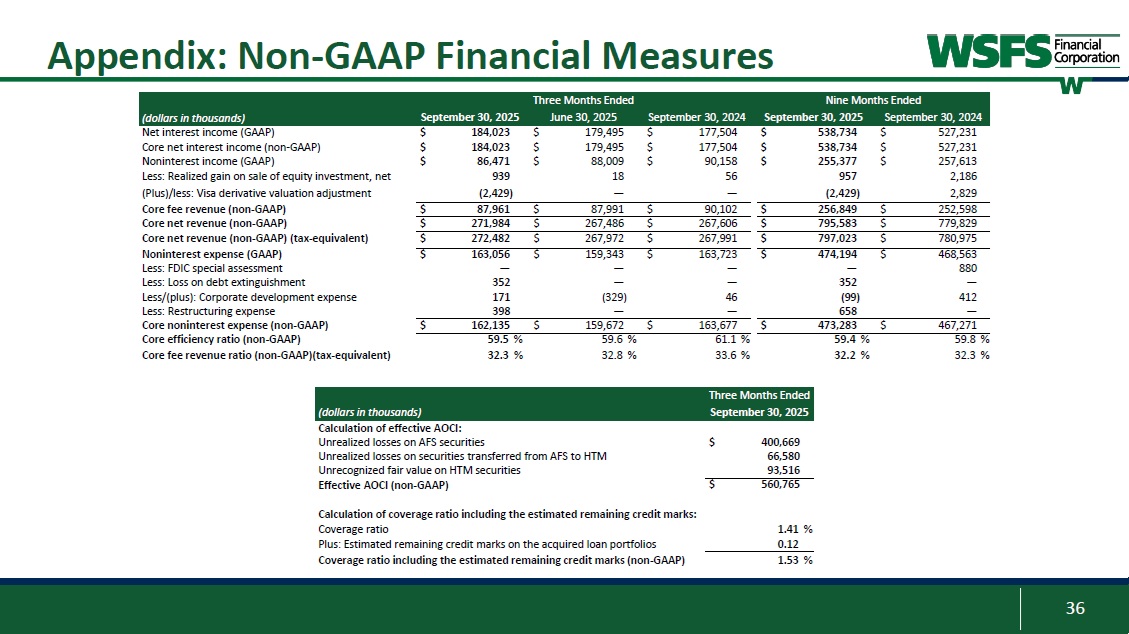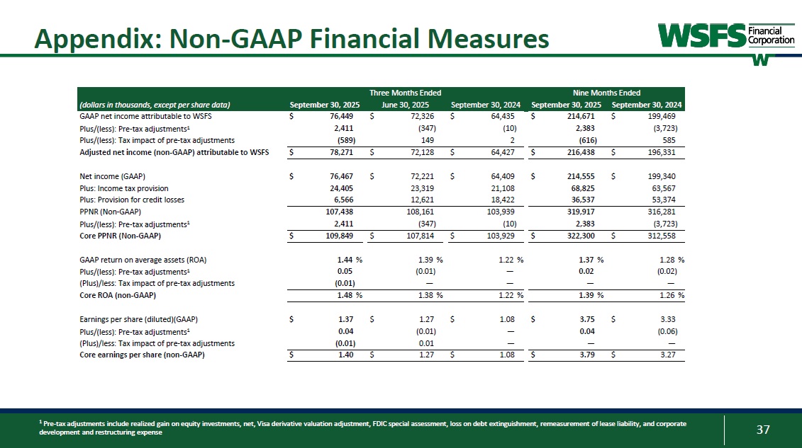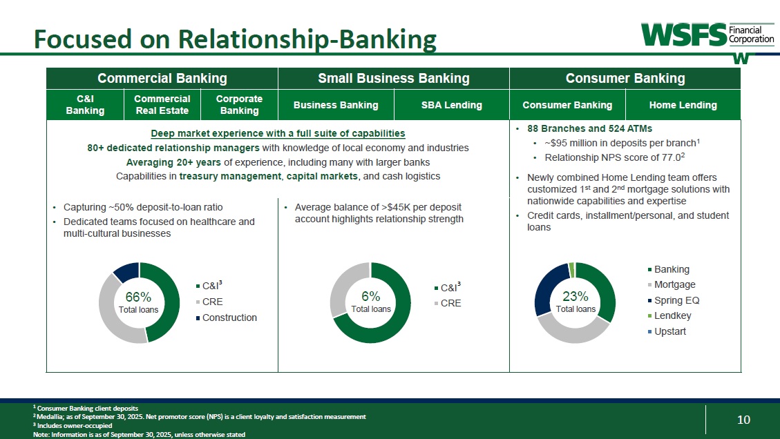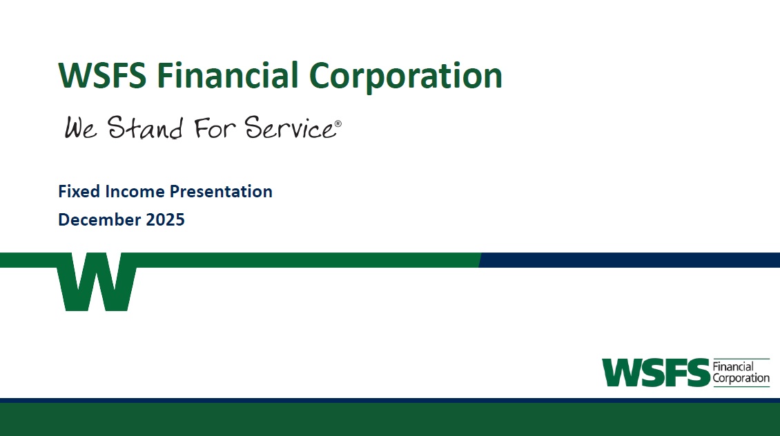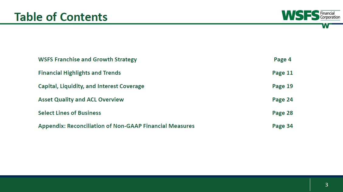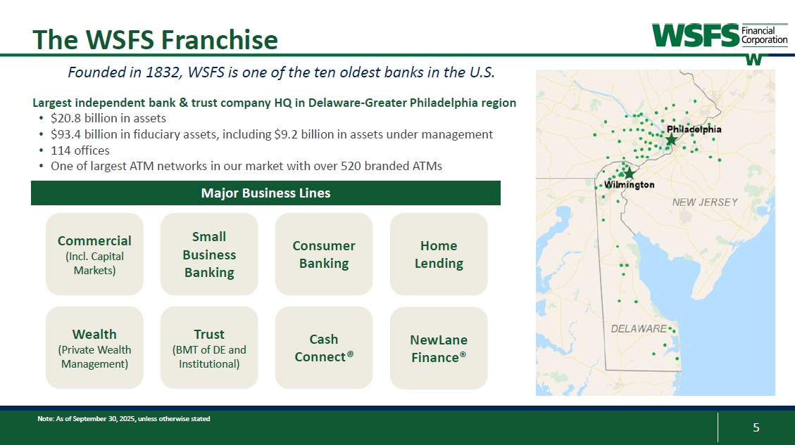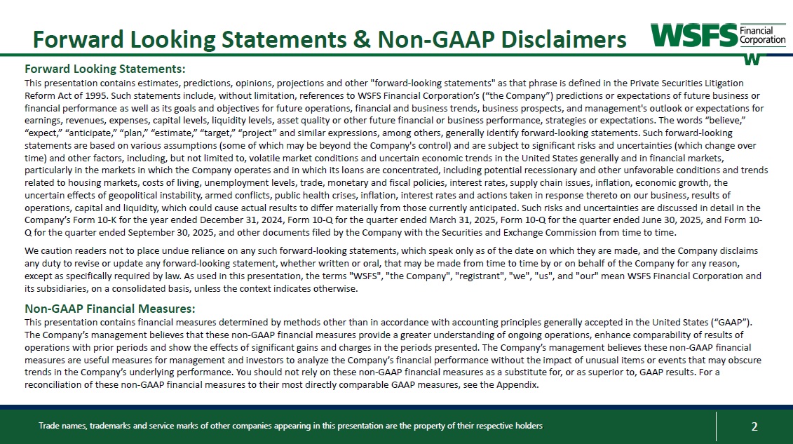 2前瞻性陈述&非GAAP免责声明本演示文稿中出现的其他公司的商号、商标和服务标记是其各自所有者的财产。前瞻性陈述:本演示文稿包含估计、预测、意见、预测和1995年《私人证券诉讼改革法案》中定义的其他“前瞻性陈述”。此类陈述包括但不限于提及WSFS金融公司(“该公司”)对未来业务或财务业绩的预测或预期,以及其对未来运营的目标和目的、财务和业务趋势、业务前景,以及管理层对收益、收入、费用、资本水平、流动性水平、资产质量或其他未来财务或业务业绩、战略或预期的展望或预期。“相信”、“预期”、“预期”、“计划”、“估计”、“目标”、“项目”等类似表述,通常可识别前瞻性陈述。此类前瞻性陈述基于各种假设(其中一些可能超出公司的控制范围),并受到重大风险和不确定性(随时间变化)和其他因素的影响,包括但不限于美国总体和金融市场的波动市场条件和不确定的经济趋势,特别是在公司经营和贷款集中的市场,包括与住房市场、生活成本、失业水平、贸易、货币和财政政策、利率相关的潜在衰退和其他不利条件和趋势,供应链问题、通货膨胀、经济增长、地缘政治不稳定的不确定影响、武装冲突、公共卫生危机、通货膨胀、利率和为此采取的行动对我们的业务、运营结果、资本和流动性的影响,这可能导致实际结果与目前的预期存在重大差异。这些风险和不确定性在公司截至2024年12月31日止年度的10-K表格、截至2025年3月31日止季度的10-Q表格、截至2025年6月30日止季度的10-Q表格和截至2025年9月30日止季度的10-Q表格以及公司不时向证券交易委员会提交的其他文件中进行了详细讨论。我们提醒读者不要过分依赖任何此类前瞻性陈述,这些陈述仅在作出之日起生效。公司不承担任何义务,以任何理由修改或更新公司或代表公司不时作出的任何前瞻性陈述,无论是书面或口头陈述,除非法律特别要求。本演示文稿中使用的术语“WSFS”、“公司”、“注册人”、“我们”、“我们”、“我们的”是指在合并基础上的WSFS金融公司及其子公司,除非上下文另有说明。非美国通用会计准则财务指标:本演示文稿包含根据美国公认会计原则(“GAAP”)以外的方法确定的财务指标。该公司管理层认为,这些非公认会计准则财务指标提供了对持续运营的更深入了解,增强了运营结果与前期的可比性,并显示了所示期间的重大收益和费用的影响。公司管理层认为,这些非公认会计准则财务指标是管理层和投资者分析公司财务业绩的有用指标,而不会受到可能掩盖公司基本业绩趋势的不寻常项目或事件的影响。你不应该依赖这些非GAAP财务指标来替代或优于GAAP结果。有关这些非GAAP财务指标与其最直接可比的GAAP指标的对账,请参见附录。