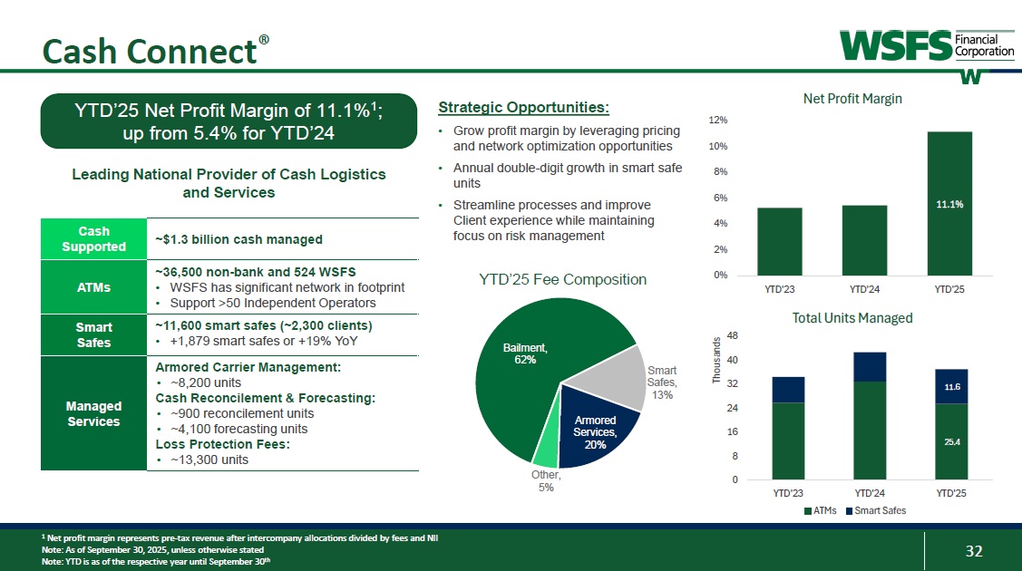 32现金通®~13亿美元现金管理现金支持~3.65万非银行和524个WSFS • WSFS的网络足迹显着•支持> 50个独立运营商的ATM机~11,600个智能保险箱(~2,300个客户端)• + 1,879个智能保险箱或同比+ 19% Smart Safes Armored Carrier Management:•~8,200个单位现金对账&预测:•~900个对账单位•~4,100个预测单位损失保护费:•~13,300个单位托管服务年初至今‘25年的净利润率为11.1% 1;高于年初至今’24全国领先的现金物流和服务托付提供商的5.4%,62%的智能保险箱,13%的装甲服务,20%其他,5%战略机会:•利用定价和网络优化机会提高利润率•智能保险箱每年实现两位数增长•简化流程并改善客户体验,同时保持对风险管理的关注1净利率为公司间分配除以费用和NII后的税前收入注:截至2025年9月30日,除非另有说明注:年初至今为截至9月30日的相应年度11.1% 0% 2% 4% 6% 8% 10% 12%年初至今‘23年初至今’24总管理单位年初至今‘25净利润率25.41 1.63 22416804840年初至今’23年初至今‘24智能保险箱年初至今’25千台ATM年初至今' 25费用构成