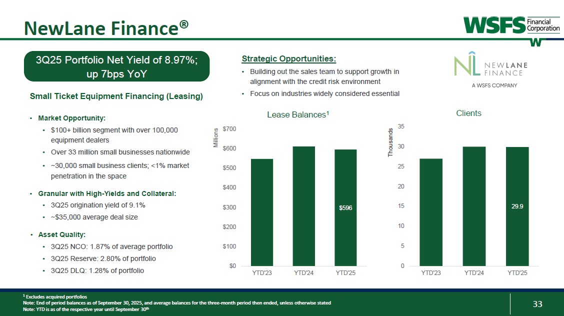 33 NewLane金融®1不包括收购的投资组合注:截至2025年9月30日的期末余额,以及随后结束的三个月期间的平均余额,除非另有说明注:年初至今截至9月30日的相应年份战略机会:•建立销售团队以支持与信用风险环境保持一致的增长•专注于被广泛认为必不可少的小票设备融资(租赁)行业•市场机会:• 1,000 +亿美元的细分市场,拥有超过100,000家设备经销商•全国超过3,300万家小企业•~30,000家小企业客户;该领域< 1%的市场渗透率•颗粒与高收益和抵押品:• 3Q25发起收益率9.1% •平均交易规模约3.5万美元•资产质量:• 3Q25 NCO:占平均投资组合的1.87% • 3Q25储备金:占投资组合的2.80% • 3Q25 DLQ:占投资组合的1.28% 29.90 5 101520253035 YTD‘23 YTD’24 YTD‘25千名客户$ 596 $ 0 $ 100 $ 200 $ 300 $ 400 $ 500 $ 600 $ 700 YTD’23 YTD‘24 YTD’25百万租赁余额1 3Q25投资组合净收益率8.97%;同比上升7bps