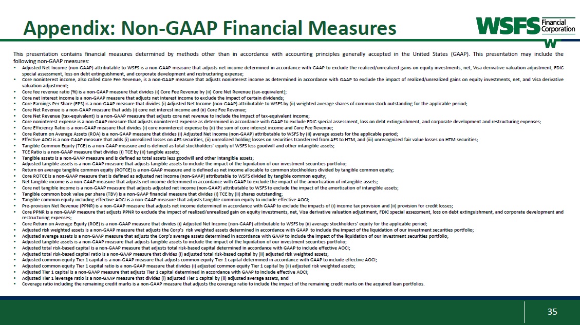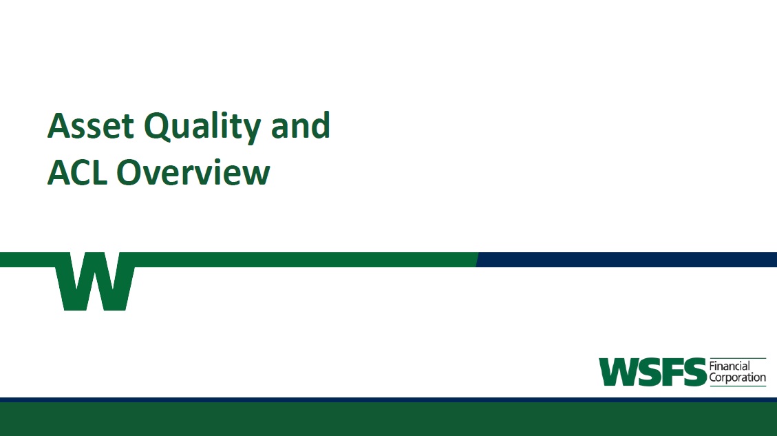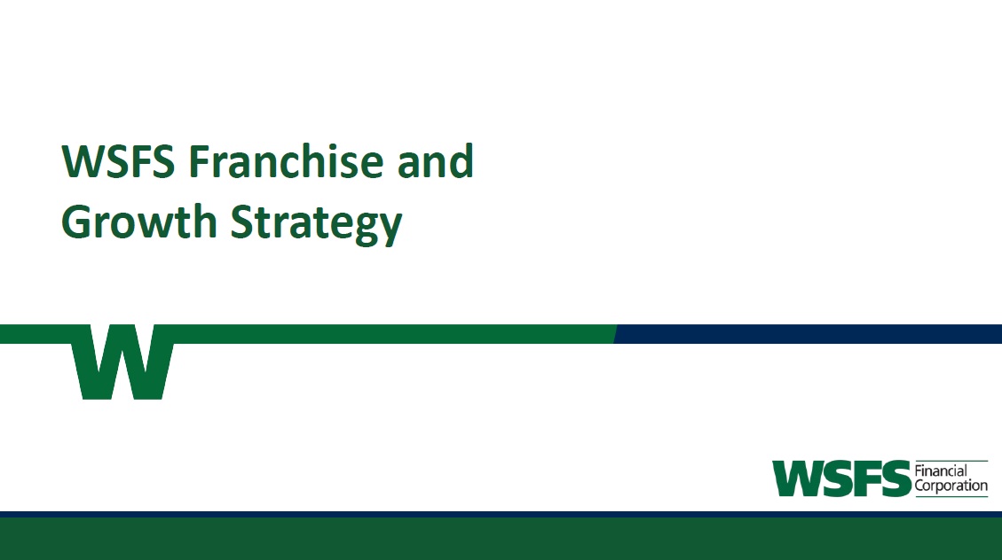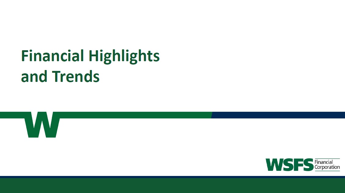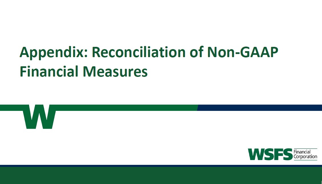 3355附录:非GAAP财务指标本演示文稿包含不按照美国公认会计原则(GAAP)的方法确定的财务指标。本演示文稿可能包括以下非GAAP衡量标准:•归属于WSFS的调整后净利润(non-GAAP)是一种非GAAP衡量标准,它调整根据GAAP确定的净收入,以排除股权投资的已实现/未实现收益净额、Visa衍生品估值调整、FDIC特别评估、债务清偿损失以及企业发展和重组费用;•核心非利息收入,也称为核心费用收入,是一种非GAAP衡量标准,调整根据GAAP确定的非利息收入,以排除股权投资的已实现/未实现收益净额的影响,和Visa衍生品估值调整;•核心费用收入比率(%)是一种非公认会计准则衡量标准,将(i)核心费用收入除以(ii)核心净收入(税收等值);•核心净利息收入是一种非公认会计准则衡量标准,调整净利息收入以排除某些股息的影响;•核心每股收益(EPS)是一种非公认会计准则衡量标准,将(i)归属于WSFS的调整后净收入(non-GAAP)除以(ii)适用期间已发行普通股的加权平均股数;•核心净收入是一种非公认会计准则衡量标准这增加了(i)核心净利息收入和(ii)核心费用收入;•核心净收入(税收等值)是一种非GAAP衡量标准,它调整核心净收入以包括税收等值收入的影响;•核心非利息费用是一种非GAAP衡量标准,它调整根据GAAP确定的非利息费用,以排除FDIC特别评估、债务清偿损失,以及企业发展和重组费用;•核心效率比率是一种非公认会计准则衡量标准,将(i)核心非利息费用除以(ii)核心利息收入和核心费用收入之和;•核心平均资产回报率(ROA)是一种非公认会计准则衡量标准,将(i)归属于WSFS的调整后净收入(non-GAAP)除以(ii)适用期间的平均资产;•有效AOCI是一种非公认会计准则衡量标准,它增加了(i)AFS证券的未实现亏损,(ii)从AFS转移到HTM的证券的未实现持有亏损,(iii)未确认的HTM证券的公允价值损失;•有形普通股权益(TCE)是一种非公认会计原则的衡量标准,定义为WSFS的股东权益总额减去商誉和其他无形资产;• TCE比率是一种非公认会计原则的衡量标准,将(i)TCE除以(ii)有形资产;•有形资产是一种非公认会计原则的衡量标准,定义为总资产减去商誉和其他无形资产;•调整后的有形资产是一种非公认会计原则的衡量标准调整有形资产以包括清算我们的投资证券组合的影响;•平均有形普通股权益回报率(ROTCE)是一种非公认会计准则衡量标准,定义为可分配给普通股股东的净收入除以有形普通股权益;•核心ROTCE是一种非公认会计准则衡量标准,定义为归属于WSFS的调整后净收入(non-GAAP)除以有形普通股权益;•净有形收入是一种非公认会计准则衡量标准调整根据公认会计原则确定的净收入,以排除无形资产摊销的影响;•核心有形净收入是一种非公认会计原则的衡量标准,它调整了归属于WSFS的调整后净收入(非公认会计原则),以排除无形资产摊销的影响;•每股有形共同账面价值(TBV)是一种非公认会计原则的财务衡量标准,将(i)TCE除以(ii)已发行股份;•包括有效AOCI在内的有形普通股权益是一种非公认会计原则的衡量标准,将有形普通股权益调整为包括有效AOCI;•拨备前净收入(PPNR)是一种非公认会计原则的衡量标准调整根据公认会计原则确定的净收入,以排除(i)所得税拨备和(ii)信贷损失拨备的影响;•核心PPNR是一种非公认会计原则的衡量标准,它调整PPNR以排除已实现/未实现收益对股权投资的影响,净额、Visa衍生品估值调整、FDIC特别评估、债务清偿损失, 以及企业发展和重组费用;•核心平均股本回报率(ROE)是一种非GAAP衡量标准,将(i)归属于WSFS的调整后净利润(non-GAAP)除以(ii)适用期间的平均股东权益;•调整后的风险加权资产是一种非GAAP衡量标准,它调整了根据GAAP确定的公司风险加权资产,以包括我们投资证券组合清算的影响;•调整后的平均资产是一种非GAAP衡量标准调整根据公认会计原则确定的公司平均资产,以包括我们投资证券组合清算的影响;•调整后的有形资产是一种非公认会计原则的衡量标准,它调整有形资产以包括我们投资证券组合清算的影响;•调整后的基于风险的总资本是一种非公认会计原则的衡量标准,它调整根据公认会计原则确定的基于风险的总资本,以包括有效的AOCI;•调整后的基于风险的总资本比率是非公认会计原则的衡量标准将(i)调整后的基于风险的资本总额除以(ii)调整后的风险加权资产;•调整后的普通股一级资本是一种非公认会计原则衡量标准,它调整根据公认会计原则确定的普通股一级资本,以包括有效的AOCI;•调整后的普通股一级资本比率是一种非公认会计原则衡量标准,将(i)调整后的普通股一级资本除以(ii)调整后的风险加权资产;•调整后的一级资本是非公认会计原则衡量标准调整根据GAAP确定的一级资本以包括有效的AOCI;•调整后的一级杠杆率是一种非GAAP衡量标准,将(i)调整后的一级资本除以(ii)调整后的平均资产;•包括剩余信用标记的覆盖率是一种非GAAP衡量标准,调整覆盖率以包括剩余信用标记对获得的贷款组合的影响……
