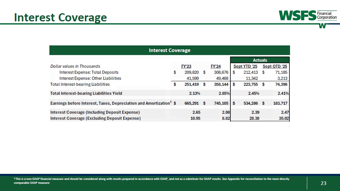 23利息覆盖率利息覆盖率1这是一种非GAAP财务指标,应与根据GAAP编制的结果一起考虑,而不是作为GAAP结果的替代品。见附录,了解与最直接可比的GAAP衡量标准美元价值的对账,单位:千利息费用:总存款利息费用:其他负债总有息负债总有息负债收益率息税前利润,折旧和摊销1利息覆盖率(包括存款费用)利息覆盖率(不包括存款费用)实际数9月QTD‘25 September YTD’25 FY‘24 FY’23 $ 71,185 $ 212,413 $ 308,676 $ 209,8203,21311,34249,46841,599 $ 74,398 $ 223,755 $ 358,144 $ 251,419 2.41% 2.45% 2.85% 2.13% $ 183,717 $ 534,286 $ 745,105 $ 665,2912.47 2.39 2.08 2.65 35.02 28.388.82 10.95