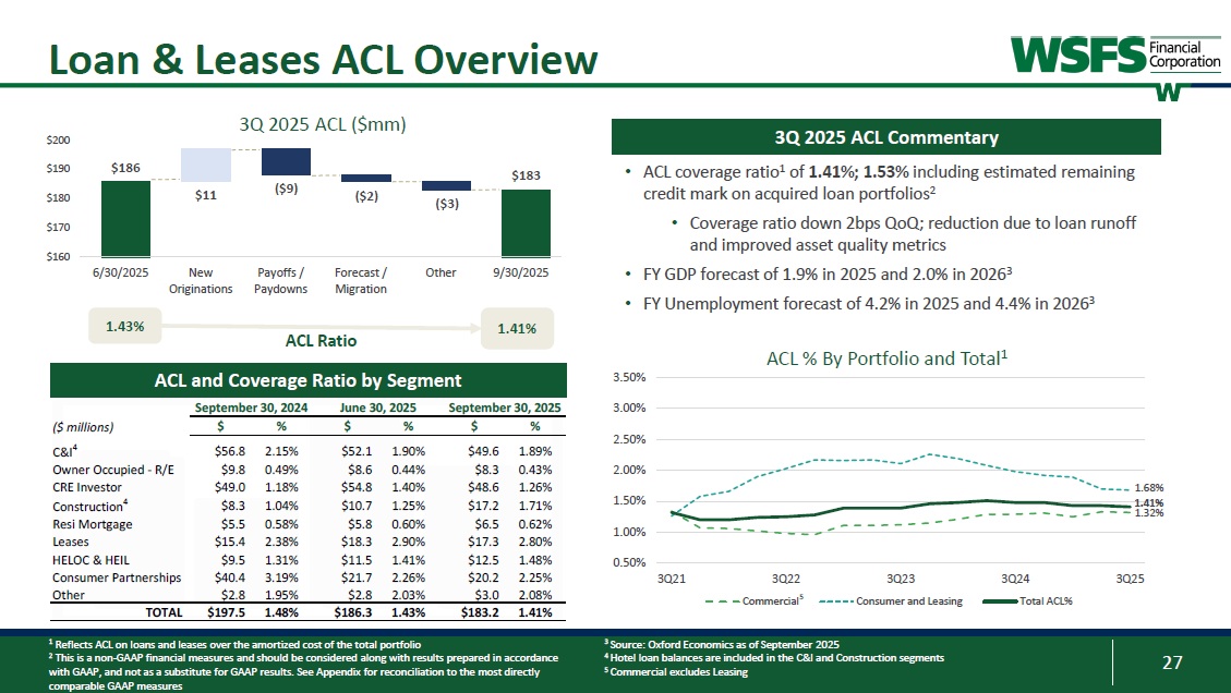 27 $ 160 $ 170 $ 180 $ 190 Q3 2025 ACL($ mm)$ 2006/30/2025新来源Payoffs/Paydowns forecast/migration Other 9/30/2025 ACL ratio $ 183 Loan & Leases ACL overview ACL and coverage ratio by segment Q3 2025 ACL commentary 1.41% • ACL coverage ratio 1 of 1.41%;1.53%,包括已获得贷款组合的估计剩余信用标记2 • coverage ratio down 2bps QoQ;reduced due to loan runoff and improved asset quality metrics • fY GDP forecast 1.9% in 2025 and 2.0% in 2026 3 • FY unemployment forecast 4.2% in 202520213年4.4% 31.43% 1.32% 1.68% 1.41% 1.00% 2.50% 3.00% 3.50% ACL %按投资组合和合计13资料来源:牛津经济研究院截至2025年9月4酒店贷款余额包括在C & I和建筑部门5商业不包括租赁1.89% $ 49.6 1.90% $ 52.1 2.15% $ 56.8 C & I 42.00% 0.43% $ 8.3 0.44% $ 8.6 0.49% $ 9.8业主占用-R/E 1.26% $ 48.6 1.40% $ 54.8 1.18% $ 49.0 CRE投资者1.50% 1.71% $ 17.2 1.25% $ 10.7 1.04% $ 8.3建筑4 $ 186 $ 11($ 9)($ 2)($ 3)Resi Mortgage $ 5.5 0.58% $ 5.8 0.60% $ 6.5 0.62% 2.80% $ 17.3 2.90% $ 18.3 2.38% $ 15.4租赁0.50% 1.48% $ 12.5 1.41% $ 11.5 1.31% $ 9.5 HELOC & HEIL 3Q25 3Q24 3Q23 3Q22 3Q21 2.25% $ 20.2 2.26和租赁商业52.08% $ 3.0 2.03% $ 2.8 1.95% $ 2.8其他总计$ 197.5 1.48% $ 186.3 1.43% $ 183.2 1.41% 1反映贷款和租赁的ACL超过总投资组合的摊余成本2这是一个非GAAP财务指标,应与根据GAAP编制的结果一起考虑,而不是作为GAAP结果的替代。与最直接可比的GAAP措施的对账见附录2024年9月30日2025年6月30日2025年9月30日(百万美元)$% $% $%