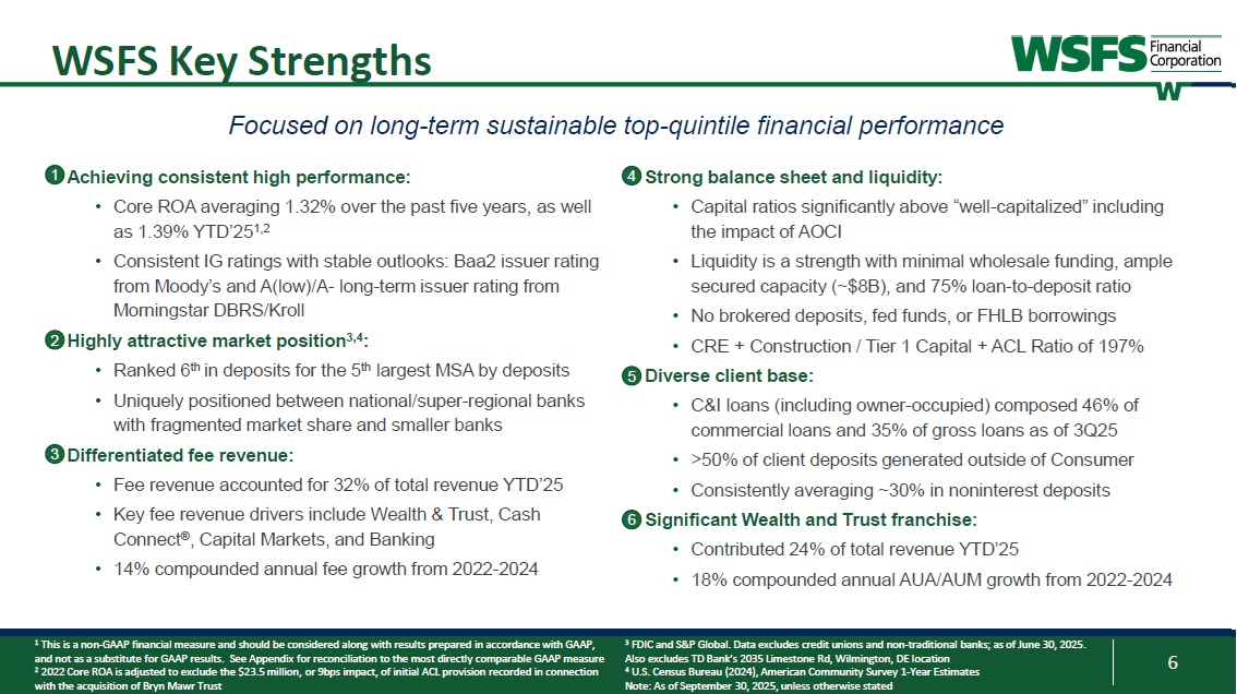 5注:截至2025年9月30日,除非另有说明,否则公司的WSFS特许经营商业(含Capital Markets)Small Business Banking Wealth(Private Wealth Management)Trust(BMT of DE and Institutional)Cash Connect®主要业务线WSFS成立于1832年,是美国历史最悠久的十家银行之一。最大的独立银行和信托公司总部位于特拉华州-大费城地区•资产208亿美元•受托资产934亿美元,其中管理资产92亿美元• 114个办事处•我们市场上最大的ATM网络之一,拥有超过520台品牌ATM消费者银行业务NewLane Finance®房屋贷款