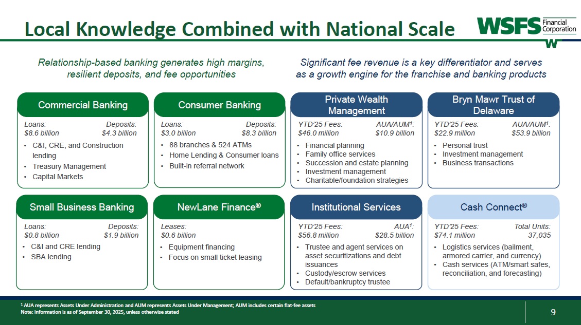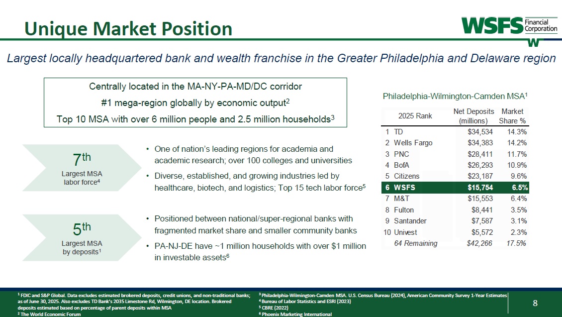 8独特的市场地位大费城和特拉华州地区总部位于当地的最大银行和财富专营权1 FDIC和标普全球。数据不包括估计的经纪存款、信用合作社和非传统银行;截至2025年6月30日。也不包括道明银行的2035 Limestone Rd,Wilmington,DE位置。经纪存款是根据MSA内母公司存款的百分比估算的2世界经济论坛3费城-威明顿-卡姆登MSA。美国人口普查局(2024年),美国社区调查1年估计数4美国劳工统计局和ESRI(2023)5 CBRE(2022)6 Phoenix Marketing International位于MA-NY-PA-MD/DC走廊的中心位置#按经济产出计全球1个巨型区域2拥有超过600万人口和250万家庭的十大MSA 37大MSA劳动力人数45大MSA按存款计算1 •全国领先的学术界地区之一,并且•位于国家/超级区域银行之间,市场份额分散和较小的社区银行• PA-NJ-DE-有约100万个家庭拥有超过100万美元的可投资资产6 Philadelphia-Wilmington-Camden MSA 1净存款(百万)市场份额% TD $ 34,53414.3% 114.2% $ 34,3832 PNC 11.7% $ 28,4113 TERM2 10.9% $ 26,293 BoFA4学术研究;超100所高校9.6% $ 23,187 Citizens 5 •以6.5%为首的多元化、成熟和成长型行业$ 15,754 丨WSFS 6医疗保健、生物技术、和物流;前15名科技劳动力56.4% $ 15,553 M & T 73.5% $ 8,441富尔顿83.1% $ 7,5879桑坦德银行2.3% $ 5,57210 Univest 17.5% $ 42,26664剩余2025年排名