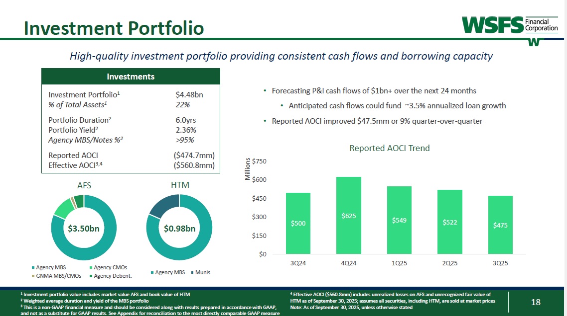 18投资组合1投资组合价值包括市值AFS和HTM的账面价值2 MBS组合的加权平均存续期和收益率3这是一种非GAAP财务指标,应与根据GAAP编制的结果一起考虑,而不是作为GAAP结果的替代。见附录,了解与最直接可比的GAAP衡量标准Investments 44.8亿美元投资组合122%%的总资产1 6.0yrs投资组合久期22.36%投资组合收益率2 > 95%机构MBS/Notes % 2($ 474.7mm)报告的AOCI($ 560.8mm)有效AOCI 3,4 AFS机构MBS GNMA MBS/CMOs机构CMOs机构债券。HTM机构MBS Munis 35.0亿美元0.98亿美元500美元625美元549美元522美元475美元0美元150美元300美元450美元600美元3Q24 4Q24 1Q25 2Q25 3Q25百万高质量投资组合,提供稳定的现金流和借贷能力•预测未来24个月P & I现金流为10亿美元以上•预期现金流可为年化贷款增长提供约3.5%的资金•报告的AOCI环比改善47.5美元或9%报告的AOCI趋势7504美元有效AOCI(560.8美元)包括截至2025年9月30日的AFS未实现损失和未确认的HTM公允价值;假设所有证券,包括HTM,均按市价出售注:截至2025年9月30日,除非另有说明
