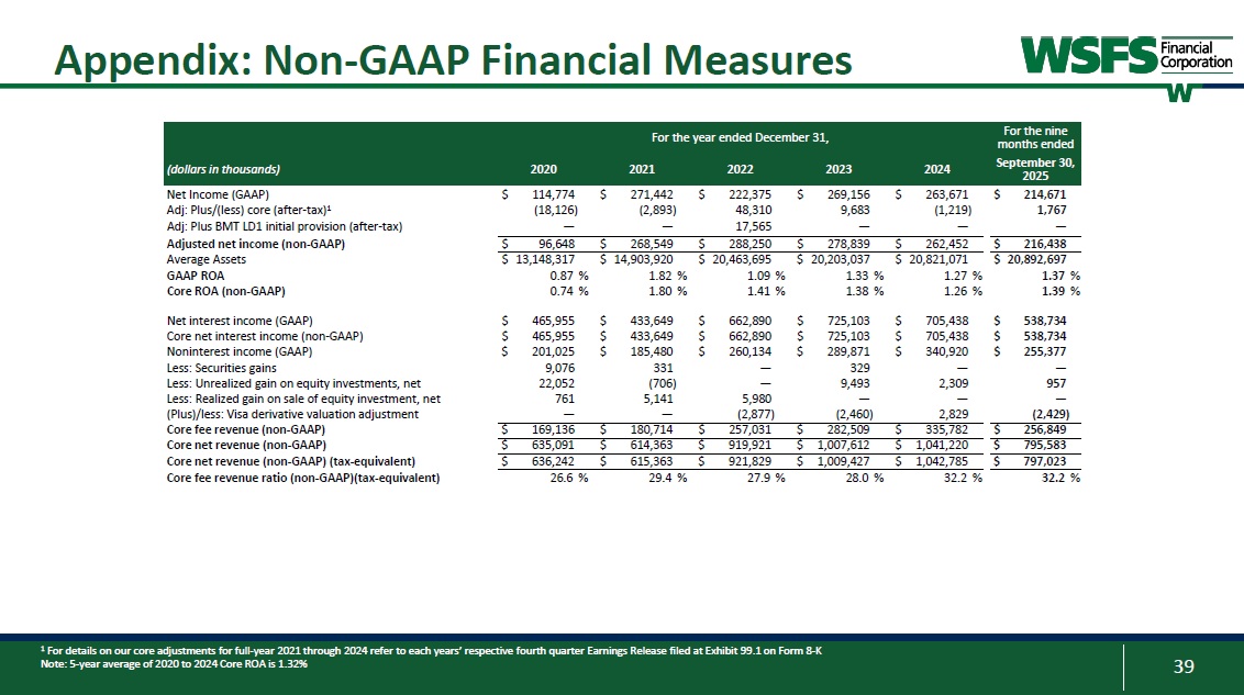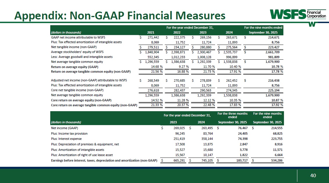 40附录:截至12月31日止年度的非美国通用会计准则财务指标,截至9个月的财务指标(单位:千美元)20212022202320249月30日,2025年GAAP归属于WSFS的净利润271,442美元222,375美元269,156美元263,671美元214,671美元加:无形资产的税后摊销8,06911,75211,72411,8938,756净有形收入(非GAAP)279,511美元234,127美元280,880美元275,564美元223,427美元WSFS平均股东权益1,848,904美元2,398,871美元2,300,467美元2,535,737美元2,661,709美元减:平均商誉和无形资产552,3451,012,2331,008,128996,899981,809净平均有形普通股权益1,296,559美元1,386,638美元1,292,339美元1,538,838美元1,679,900美元平均股本回报率(GAAP)14.68% 9.27% 11.70% 10.40% 10.78%平均有形普通股权益回报率(Non-GAAP)21.56% 16.88% 21.73% 17.91% 17.78%调整后归属于WSFS的净利润(non-GAAP)268,549美元270,685美元278,839美元262,452美元216,438美元加:无形资产税后摊销8,06911,75211,72411,8938,756核心净有形收入(Non-GAAP)276,618282,437290,5632741,386,6381,292,3391,538,8381,679,900核心平均股本回报率(非美国通用会计准则)14.52% 11.28% 12.12% 10.35% 10.87%核心平均有形普通股股本回报率(非美国通用会计准则)21.33% 20.37% 22.48% 17.83% 17.92%截至12月31日止年度,截至9个月止三个月(单位:千美元)202320242025年9月30日2025年9月30日净收入(GAAP)269,025美元263,495美元76,467美元214,555美元加:所得税准备金96,24583,76424,40568,825加:利息支出251,419358,14474,398223,755加:房地和设备折旧,净额17,50813,8752,8478,916加:无形资产摊销15,52715,6803,77811,571加:使用权租赁资产摊销15,56710,1471,8226,664未计利息、税项、折旧及摊销前利润(非公认会计原则)665,291美元745,105美元183,717美元534,286美元