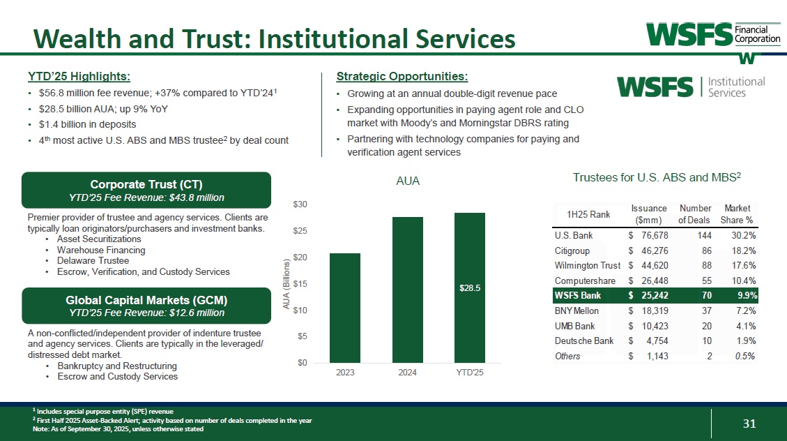 30 Wealth and Trust:Private Wealth and Personal Trust 02,0004,0006,0008,000 3Q23 3Q24 Relations 3Q25 Personal Trust Relationship and Account Growth Accounts Private Wealth Management(PWM)YTD‘25费用收入:4600万美元Bryn Mawr Trust of Delaware YTD’25费用收入:2290万美元受托人和咨询服务、财务规划、投资管理,为高净值客户提供家族办公室和传统银行服务为美国和国际上支持个人和家庭的顾问提供的个人信托和信托服务• 6890万美元的手续费收入;与年初至今相比+ 4%‘24 • 556亿美元的AUA和92亿美元的AUM •成功地在内部转介了约2.35亿美元的AUM •9亿美元的私人银行存款年初至今’25亮点:战略机遇:•财富客户在我们足迹中的渗透率低于5%;代表着重要的增长机会•扩大战略合作伙伴关系以及转介计划•将信托服务更广泛地分配给财富、法律、和税务顾问$ 55.6 $ 9.2 $ 20 $ 30 $ 40 $ 50 $ 60 $ 70 20232024 YTD'25 AUA/AUM(十亿)AUA/AUM AUM注:截至2025年9月30日,除非另有说明