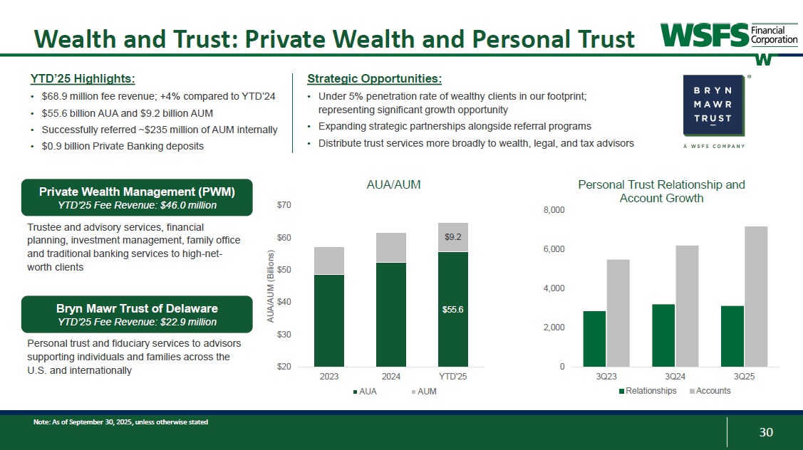 29 Wealth and Trust:概览1 标普全球;从TTM(过去12个月)信托活动中产生的年化收入超过1500万美元且资产在5B美元到100B美元之间的银行和储蓄机构;截至2025年11月15日的数据2不包括公司间分配3 Medallia注:截至2025年9月30日,除非另有说明,否则$ 34.6 $ 64.5 $ 78.1 $ 89.4 $ 93.4 $ 0 $ 20 $ 40 $ 60 $ 80 $ 100 $ 12012021202220232024 YTD‘25亿AUA AUM AUA和AUM Trend Premier全方位服务的国家财富和信托特许经营权•多元化费用收入:•年初至今’25年为1.257亿美元,与年初至今相比增长16%‘242 •年初至今’25的费用中有67%来自基于AUM的服务之外•卓越服务:•财富NPS得分为76.13;利用布林莫尔信托®品牌在1000亿美元资产以下的全方位服务银行中排名第5的财富业务1基于交易,17%基于账户,50%基于AUM,33%年初至今‘25费用构成2 $ 63.4 $ 124.8 $ 13 2.5 $ 148.1 $ 125.7 $ 0 $ 30 $ 60 $ 90 $ 120 $ 150 $ 1802021202220232024 YTD’25百万费用收入趋势2 YTD'24:$ 108.3