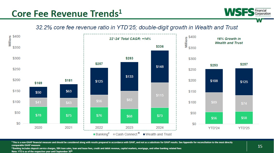 14核心ROTCE1净息差核心ROA1,2核心费用收入% 1,3核心指标– 5年趋势1.80% 1.41% 1.38% 1.26% 1.39% 0.0% 0.4% 0.8% 1.2% 1.6% 2.0% 2021202220232024 YTD‘25 29.4% 27.9% 28.0% 32.2% 32.2% 24.0% 26.0% 28.0% 30.0% 32.0% 34.0% 2021202220232024 YTD’25 3.23% 3.71% 4.11% 3.82% 3.89% 0.0% 1.0% 2.0% 3.0% 4.0% 5.0% 2021202220232024 YTD‘25 21.33% 20.37% 22.48% 17.83% 17.92% 1.4% 6.4% 11.4% 16.4% 21.4% 26.4% 2021202220232024 YTD’25 1这些是非公认会计准则财务指标并且应该与根据GAAP编制的结果一起考虑,而不是作为GAAP结果的替代品。见附录,了解与最直接可比的GAAP措施的对账情况22022年核心ROA进行了调整,以排除与收购Bryn Mawr Trust相关的初始ACL拨备的2350万美元或9个基点的影响3%代表核心费用(非利息)收入/核心净收入总额