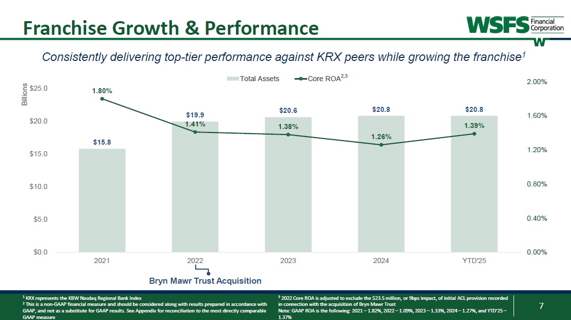 6 WSFS关键优势侧重于长期可持续的最高五分之一财务业绩1这是一种非公认会计准则财务指标,应与根据公认会计准则编制的结果一起考虑,而不是替代公认会计准则的结果。与最直接可比的GAAP衡量标准2的对账见附录2022核心ROA进行了调整,以排除与收购Bryn Mawr Trust相关的初始ACL拨备的2350万美元或9bps影响强劲的资产负债表和流动性:•资本比率明显高于“资本充足”,包括AOCI的影响•流动性是一种优势,批发融资最少,担保能力充足(~$ 8B),贷存比75% •没有中介存款、联邦基金,或FHLB借款• CRE +建筑/一级资本+ ACL比率达197%客户群多样化:•截至2015年第三季度,C & I贷款(包括自住贷款)占商业贷款的46%,占总贷款的35% •超过50%的客户存款产生于消费者之外•一直平均约30%为无息存款重要的财富和信托专营权:•年初至今贡献了总收入的24% ' 25 • 2022-2024年期间,AUA/AUM复合年增长18%,实现了持续的高业绩:•过去五年,核心ROA平均为1.32%,以及年初至今1.39%的251,2 • IG评级一致,展望稳定:穆迪给予Baa2发行人评级,晨星信息 DBRS/Kroll给予A(低)/A-长期发行人评级极具吸引力的市场地位3,4:•存款排名第6位,为按存款计算的第5大MSA •在市场份额分散的全国性/超区域性银行和规模较小的银行之间具有独特的定位差异化手续费收入:•手续费收入占总收入的32%年初至今' 25 •关键的手续费收入驱动因素包括Wealth & Trust、Cash Connect®,资本市场,和银行•从2022-2024年的年费复合增长率为14% 1234563 FDIC和标普全球。数据不包括信用合作社和非传统银行;截至2025年6月30日。还不包括道明银行的2035 Limestone Rd,Wilmington,DE位置4美国人口普查局(2024年),美国社区调查1年估计注:截至2025年9月30日,除非另有说明