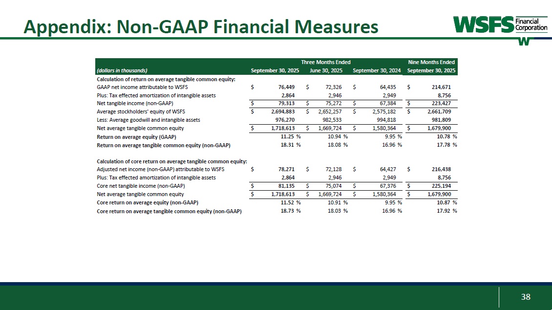 3388附录:Non-GAAP财务指标三个月结束九个月结束(千美元)2025年9月30日2025年6月30日2025年9月30日2024年9月30日,2025年平均有形普通股权益回报率计算:GAAP归属于WSFS的净利润76,449美元72,326美元64,435美元214,671美元加:无形资产的税后摊销2,8642,9462,9498,756净有形收入(非GAAP)79,313美元75,272美元67,384美元223,427美元WSFS平均股东权益2,694,883美元2,652,257美元2,575,182美元2,661,709减:平均商誉和无形资产976,270982,533994,818981,809净平均有形普通股本1,718,613美元1,669,724美元1,580,364美元1,679,900美元平均股本回报率(公认会计原则)11.25% 10.94% 9.95% 10.78%平均有形普通股本回报率(非公认会计原则)18.31% 18.08% 16.96% 17.78%平均有形普通股本核心回报率的计算:归属于WSFS的调整后净收入(非公认会计原则)78,271美元72,128美元64,427美元216,438美元加:无形资产的税后摊销2,8642,9462,9498,756核心净有形收入(非公认会计原则)81,135美元75,074美元67,376美元225,194净平均有形普通权益$ 1,718,613 $ 1,669,724 $ 1,580,364 $ 1,679,900核心平均权益回报率(非美国通用会计准则)11.52% 10.91% 9.95% 10.87%核心平均有形普通股权益回报率(非美国通用会计准则)18.73% 18.03% 16.96% 17.92%