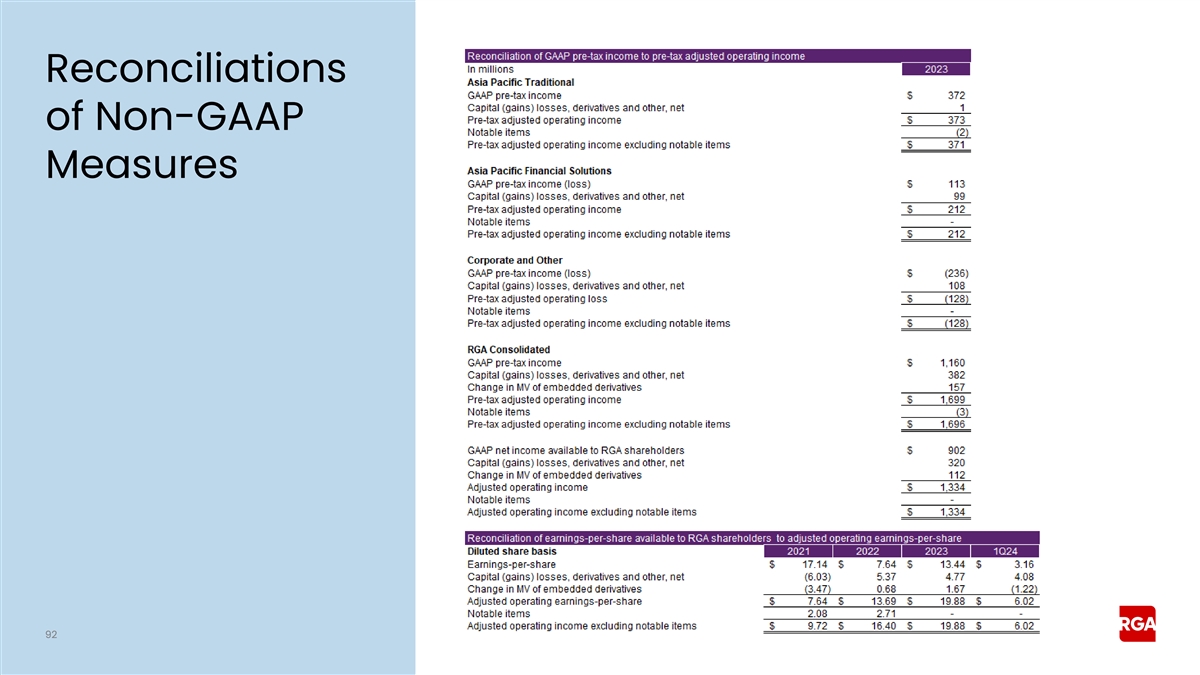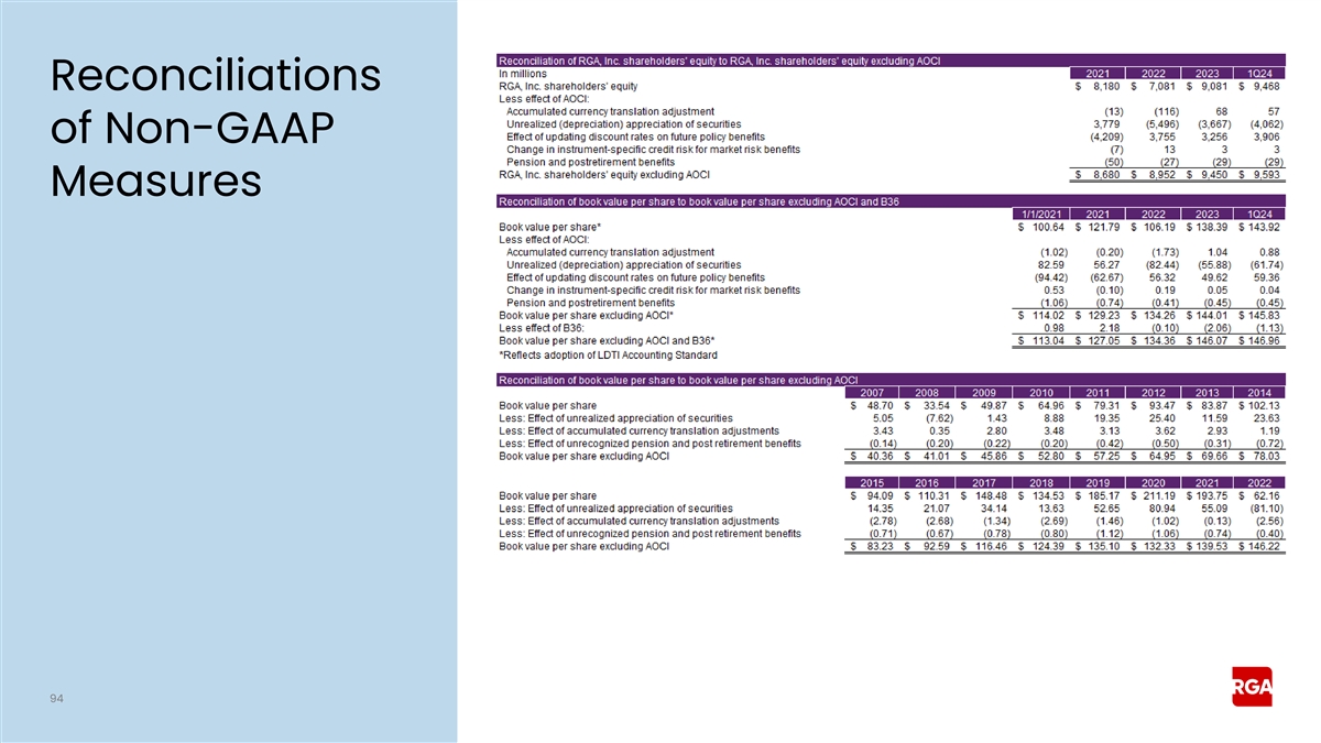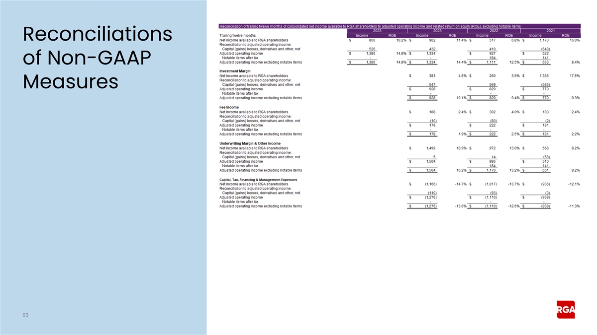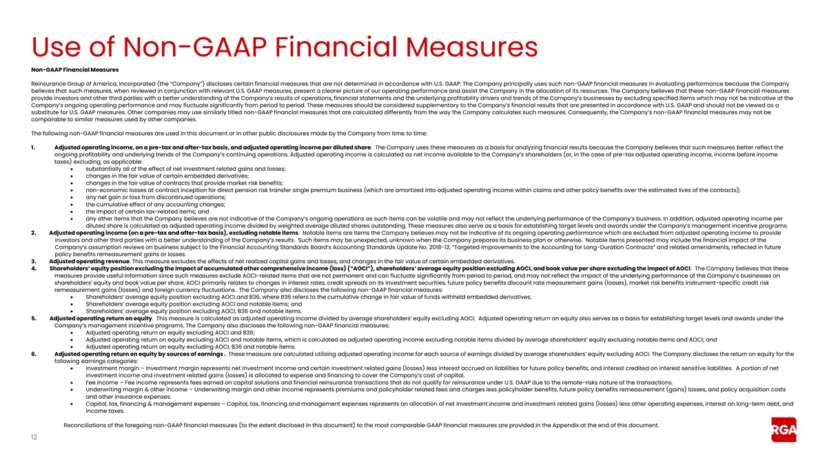 采用非公认会计准则财务指标非公认会计准则财务指标美国再保险集团,Incorporated(“公司”)披露的某些财务指标不是根据美国公认会计原则确定的。公司主要在评估业绩时使用此类非公认会计准则财务指标,因为公司认为,当与相关的美国公认会计准则指标一起审查时,这些指标更清楚地反映了我们的经营业绩,并有助于公司分配其资源。公司认为,这些非公认会计准则财务指标通过排除可能不代表公司持续经营业绩并可能在不同时期出现大幅波动的特定项目,使投资者和其他第三方更好地了解公司的经营业绩、财务报表以及公司业务的基本盈利驱动因素和趋势。这些措施应被视为对公司按照美国公认会计原则列报的财务业绩的补充,不应被视为替代美国公认会计原则措施。其他公司可能会使用类似标题的非GAAP财务指标,其计算方式与公司计算此类指标的方式不同。因此,该公司的非GAAP财务指标可能无法与其他公司使用的类似指标进行比较。本文件或公司不时进行的其他公开披露中使用了以下非GAAP财务指标:1。调整后的营业收入,在税前和税后基础上,调整后的每股摊薄营业收入。公司使用这些衡量标准作为分析财务业绩的基础,因为公司认为这些衡量标准更好地反映了公司持续经营的持续盈利能力和基本趋势。调整后的营业收入计算为公司股东可获得的净收入(或,在税前调整后营业收入的情况下,为所得税前收入),不包括,如适用:•几乎所有净投资相关损益的影响;•某些嵌入衍生工具的公允价值变动;•合同公允价值变动提供市场风险收益;•直接养老金风险转移单一保费业务合同开始时的非经济损失(在合同的估计寿命内在索赔和其他保单收益范围内摊销为调整后的营业收入);•任何终止经营的净收益或损失;•任何会计变更的累积影响;•某些与税收有关的项目的影响;•公司认为不能表明公司持续经营的任何其他项目,因为这些项目可能具有波动性,可能无法反映公司业务的基本业绩。此外,调整后每股摊薄营业收入的计算方法为调整后营业收入除以加权平均摊薄流通股。这些措施也可作为根据公司管理层激励计划建立目标水平和奖励的基础。2.调整后的营业收入(税前和税后基础上),不包括值得注意的项目。值得注意的项目是公司认为可能不能表明其持续经营业绩的项目,这些项目被排除在调整后的营业收入之外,以便让投资者和其他第三方更好地了解公司的业绩。这类项目可能是意料之外的,公司在编制业务计划时未知或其他情况。列报的值得注意的项目可能包括公司假设审查对受财务会计准则委员会会计准则更新第2018-12号“有针对性地改进长期合同会计处理”和相关修订约束的业务的财务影响,反映在未来的政策利益重新计量损益中。3.调整后营业收入。该计量不包括已实现资本损益净额的影响,以及某些嵌入衍生工具的公允价值变动。4.剔除累计其他综合收益(亏损)影响的股东权益头寸(“AOCI”)、剔除AOCI的股东平均权益头寸、剔除AOCI影响的每股账面价值。公司认为,这些措施提供了有用的信息,因为这些措施不包括与AOCI相关的项目,这些项目不是永久性的,可能会在不同时期出现大幅波动,并且可能无法反映公司业务的基本业绩对股东权益和每股账面价值的影响。AOCI主要涉及利率变动、其投资证券的信用利差、未来保单利益贴现率计量收益(损失)、 市场风险受益于特定工具信用风险重新计量收益(损失)和外币波动。公司还披露了以下非公认会计准则财务指标:•不含AOCI和B36的股东平均权益头寸,其中B36是指扣减嵌入衍生工具的资金的公允价值累计变动;•不含AOCI和值得注意项目的股东平均权益头寸;•不含AOCI、B36和值得注意项目的股东平均权益头寸。5.调整后的经营净资产收益率。这一衡量标准的计算方法是调整后的营业收入除以不含AOCI的平均股东权益。调整后的经营股本回报率也可作为根据公司管理层激励计划建立目标水平和奖励的基础。公司还披露了以下非GAAP财务指标:•不包括AOCI和B36的调整后经营净资产收益率;•不包括AOCI和值得注意项目的调整后经营净资产收益率,计算方法为不包括值得注意项目的调整后营业收入除以不包括值得注意项目和AOCI的平均股东权益;•不包括AOCI、B36和值得注意项目的调整后经营净资产收益率。6.按收益来源调整的经营股本回报率。这些衡量标准的计算方法是利用每一盈利来源的调整后营业收入除以不包括AOCI的平均股东权益。公司披露了以下收益类别的股本回报率:•投资保证金–投资保证金是指净投资收益和某些与投资相关的收益(损失)减去为未来保单利益而应计负债的利息,以及利息敏感负债的贷记利息。净投资收益和投资相关收益(损失)的一部分分配给费用和融资,以支付公司的资本成本。•费用收入–费用收入指由于交易的远程风险性质,在美国公认会计原则下不符合再保险条件的资本解决方案和财务再保险交易上赚取的费用。•承保保证金和其他收入–承保保证金和其他收入指保费和投保人相关费用和收费减去投保人利益、未来保单利益重新计量(收益)损失以及保单购置成本和其他保险费用。•资本、税收、融资和管理费用–资本、税收、融资和管理费用是指净投资收益和投资相关收益(损失)减去其他运营费用、长期债务利息和所得税的分配。上述非G
