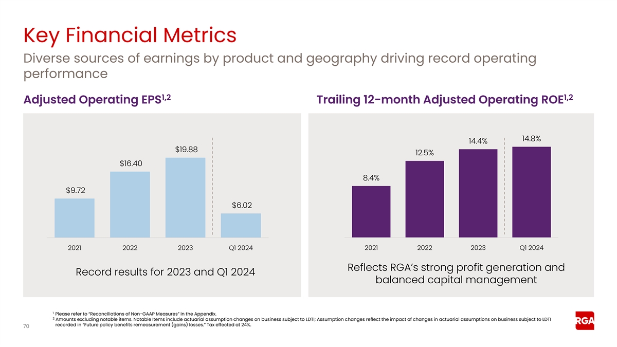主要财务指标按产品和地域划分的不同收益来源推动创纪录的经营业绩1,21,2调整后的经营EPS过去12个月的调整后经营ROE 14.8% 14.4% $ 19.88 12.5% $ 16.408.4% $ 9.72 $ 6.02 202120222023Q1 2024202220222023Q1 2024反映了RGA强劲的利润生成和2023年和2024年第一季度平衡资本管理的创纪录业绩1请参阅附录中的“非公认会计原则措施的调节”。2金额,不包括值得注意的项目。值得注意的项目包括受LDTI约束的业务的精算假设变化;假设变化反映了“未来保单利益重新计量(收益)损失”中记录的受LDTI约束的业务的精算假设变化的影响。税率为24%。70