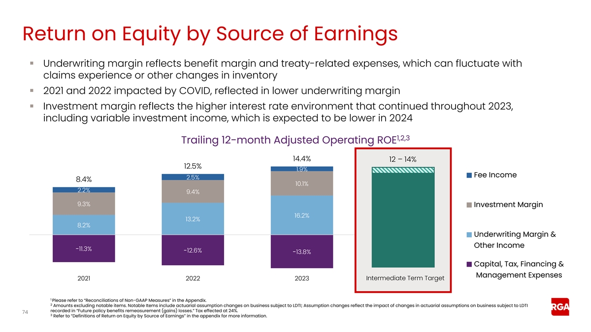 按收益来源划分的股本回报率▪承保利润率反映了受益利润率和与条约相关的费用,这些费用可能会随着索赔经验或库存的其他变化而波动▪ 2021年和2022年受新冠疫情影响,反映在较低的承保利润率▪投资利润率反映了整个2023年持续的较高利率环境,包括可变投资收入,预计在2024年会更低1,2,3过去12个月调整后经营ROE 14.4% 12 – 14% 12.5% 1.9%手续费收入2.5% 8.4% 10.1% 2.2% 9.4% 9.3%投资利润率16.2% 13.2% 8.2%承保利润率和其他收入-11.3 %-12.6 %-13.8 %资本、税收、融资与管理费用202120222023中期目标1请参阅附录中的“非GAAP措施的调节”。2金额,不包括值得注意的项目。值得注意的项目包括受LDTI约束的业务的精算假设变化;假设变化反映了“未来保单利益重新计量(收益)损失”中记录的受LDTI约束的业务的精算假设变化的影响。税率为24%。743有关更多信息,请参阅附录中的“按收益来源划分的股本回报率的定义”。