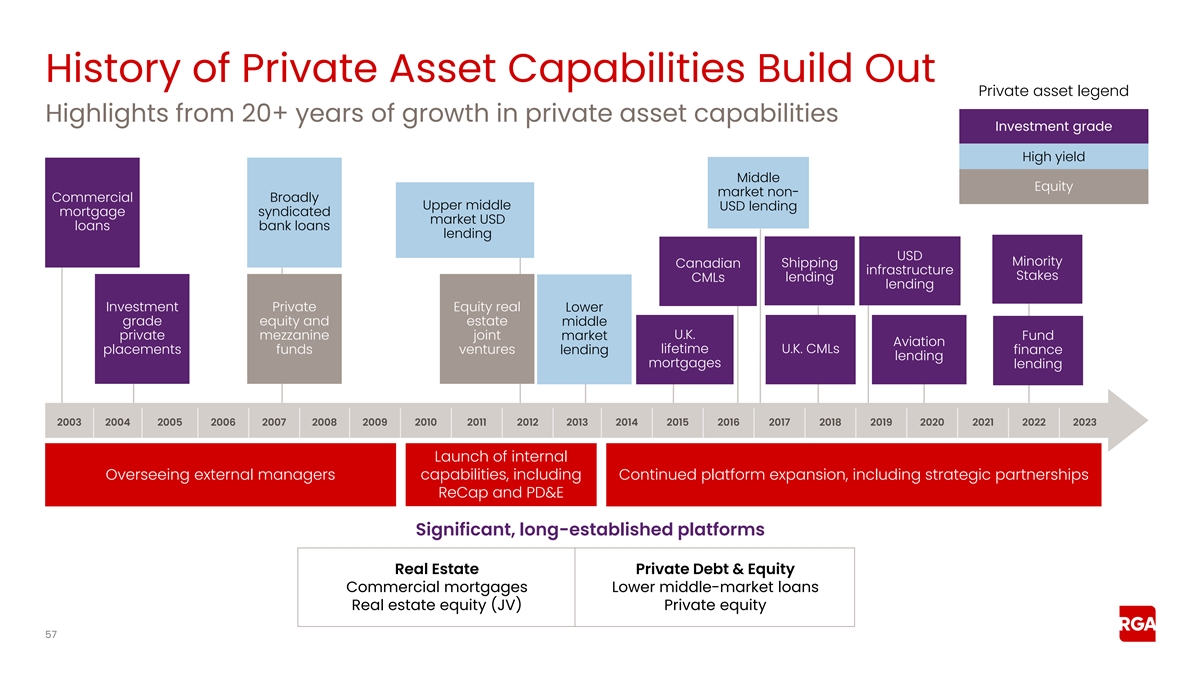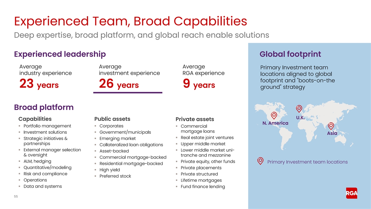 经验丰富的团队、广阔的能力深厚的专业知识、广阔的平台,和全球覆盖使能解决方案经验丰富的领导力全球足迹平均平均平均初级投资团队行业经验投资经验RGA经验地点与全球足迹和靴子对齐23年26年9年地面战略广阔平台英国能力公共资产Private Assets N. America ▪投资组合管理▪企业▪商业抵押贷款▪投资解决方案▪政府/市政亚洲▪房地产合资企业▪战略举措& ▪新兴市场合作伙伴关系▪上中间市场▪抵押贷款义务▪外部管理人选择▪下中间市场uni-▪资产支持和监督部分和夹层▪商业抵押贷款支持▪ ALM、对冲▪私募股权、其他基金初级投资团队所在地▪住宅抵押贷款支持▪量化/建模▪私募▪高收益▪风险和合规▪私人结构化▪优先股▪运营▪终身抵押贷款▪数据和系统▪基金融资借贷55