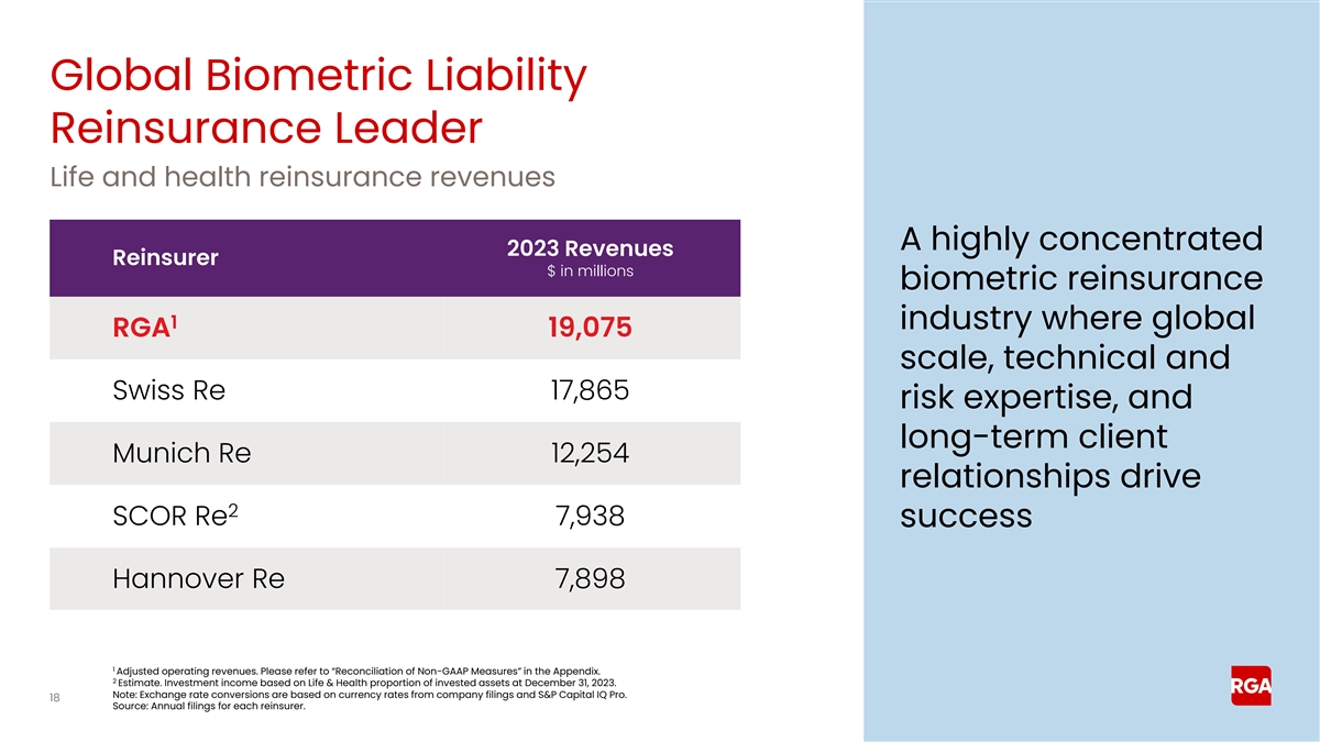 全球生物识别责任再保险领导者人寿和健康再保险收入A高度集中的2023年收入再保险公司数百万美元的生物识别再保险1个行业中,全球RGA有19,075个规模,技术和瑞士再保险有17,865个风险专业知识,长期客户慕尼黑再保险有12,254个关系,推动2个TERM0 re 7,938成功汉诺威re 7,8981调整后的营业收入。请参阅附录中的“Non-GAAP措施的调节”。2估计。基于生命健康占2023年12月31日投资资产比例的投资收益。注:汇率换算基于公司备案的货币汇率和标普 Capital IQ Pro。18资料来源:各再保险公司的年度申报。