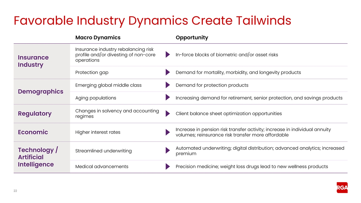 有利的行业动态创造顺风宏观动态机会保险业重新平衡风险状况和/或剥离生物识别和/或资产风险的非核心有效区块保险业务行业保障缺口对死亡率、发病率和长寿产品的需求新兴的全球中产阶级对保障产品的需求人口老龄化人口对退休、老年保障的需求增加,和储蓄产品偿付能力变化和会计客户资产负债表优化机会监管制度增加养老金风险转移活动;个人年金增加利率更高经济体量;再保险风险转移更实惠自动化承保;数字分销;高级分析;技术增加/简化承保保费人工智能医疗进步精准医疗;减肥药物导致新的健康产品22