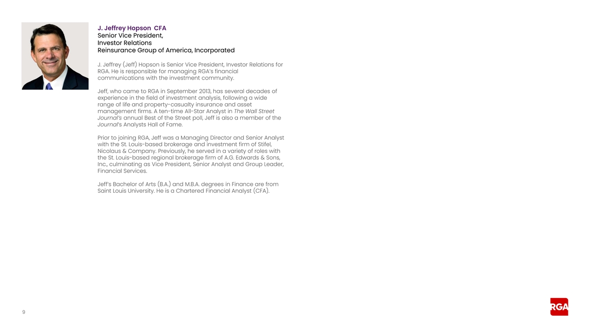 J. Jeffrey Hopson CFA投资者关系高级副总裁美国再保险集团,注册成立J. Jeffrey(Jeff)Hopson是RGA投资者关系高级副总裁。他负责管理RGA与投资界的财务沟通。Jeff,2013年9月来到RGA,在投资分析领域拥有数十年经验,曾广泛跟踪人寿和财险以及资产管理公司。杰夫曾十次入选《华尔街日报》年度最佳华尔街投票的全明星分析师,同时也是《华尔街日报》分析师Hall of Fame的成员之一。在加入RGA之前,Jeff是总部位于圣路易斯的经纪和投资公司Stifel,Nicolaus & Company的董事总经理和高级分析师。此前,他曾在总部位于圣路易斯的区域经纪公司A.G. Edwards & Sons,Inc.担任过多种职务,最终担任金融服务副总裁、高级分析师和集团负责人。杰夫的文学学士(B.A.)和金融硕士学位来自圣路易斯大学。他是一名特许金融分析师(CFA)。9