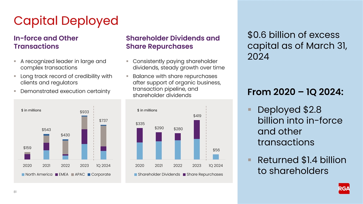 Ruby Re第三方资本投资者Cedants ▪提供第三方股权资本以支持RGA的增长目标Ruby Re Holding –符合不可预测的交易公司规模和不确定的交易时间的及时股权资本▪作为一家在密苏里州注册的第三方再保险公司,与离岸结构相比,在岸Ruby Re RGARGA Services(MO Domicile)结构为RGA的集团监管机构提供了明显更强的洞察力▪ Ruby Re将获得符合条件的美国资产密集型业务的配额份额,受制于某些条件Efficiently Levelages –在RGA平台中执行并于2023年12月提供承诺的25亿美元现有负债的初始转分保▪ RGA通过向Capital Ruby Re提供服务(包括资产管理、交易发起和执行后管理服务)获得稳定的费用收入80