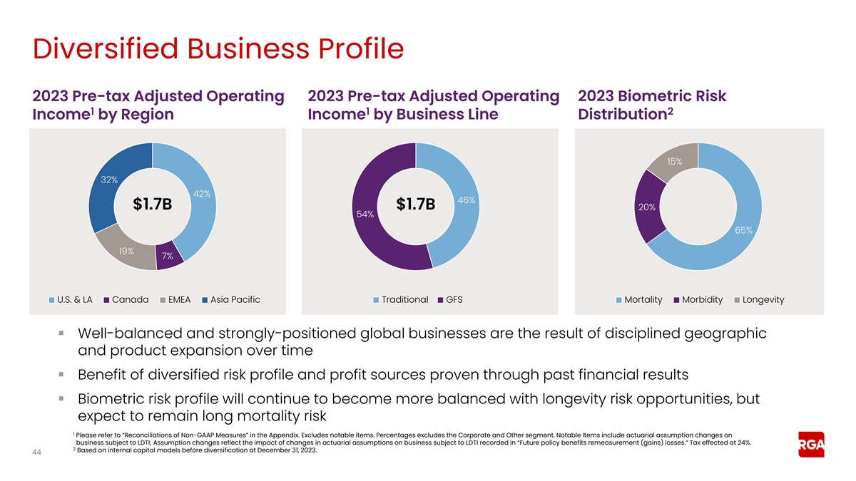 多元化业务概况2023税前调整后经营2023税前调整后经营2023生物识别风险112按地区划分的收入按业务线分布划分的收入15% 32% 42% 46% $ 1.7B $ 1.7B 20% 54% 65% 19% 7%美国&加拿大EMEA亚太地区传统的GFSTERM0死亡率发病率长寿▪均衡且处于强势地位的全球业务是随着时间的推移有纪律的地域和产品扩张的结果▪多样化风险状况和利润来源的好处已通过过去的财务业绩得到证明▪生物识别风险状况将继续与长寿风险机会变得更加平衡,但预计仍将长期存在死亡风险1请参阅附录中的“非公认会计原则措施的调节”。不包括值得注意的项目。百分比不包括企业和其他部分。值得注意的项目包括受LDTI约束的业务的精算假设变化;假设变化反映了“未来保单利益重新计量(收益)损失”中记录的受LDTI约束的业务的精算假设变化的影响。税率为24%。2基于2023年12月31日多元化前的内部资本模型。44