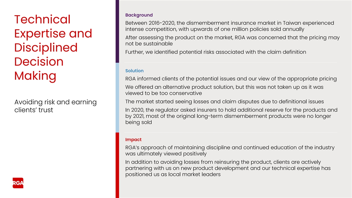 背景技术2016-2020年期间,台湾肢解保险市场经历了激烈的竞争,每年售出的保单高达一百万份以上,专业知识,在对市场上的产品进行评估后,RGA担心定价可能不具有可持续性。此外,我们识别了与索赔定义决策解决方案相关的潜在风险,从而使RGA将潜在问题告知客户,并且我们认为适当的定价我们提供了替代产品解决方案,但这被视为过于保守而未被采纳2020年市场开始出现因规避风险和收益的定义问题导致的损失和索赔纠纷,监管机构要求险企在2021年之前为产品和客户的信托持有额外准备金,大部分原有的长期肢解产品已不再销售影响RGA保持纪律并继续对行业进行教育的做法,除了避免产品再保险的损失外,最终也被积极看待,客户正在积极与我们合作开发新产品,我们的技术专长使我们成为当地市场的领导者