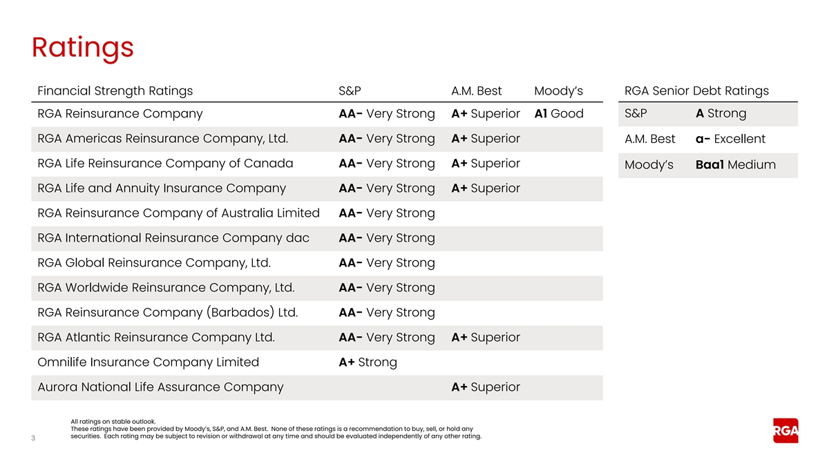 财务实力评级标普 A.M. Best Moody’s RGA高级债项评级RGA Reinsurance Company,Ltd. AA-Very Strong A + Superior A1 Good TERM0 RGA RGA Americas Reinsurance Company,Ltd. AA-Very Strong A + Superior A.M. Best a-Excellent TERM0 Life Reinsurance Company of Canada AA-Very Strong A + Superior Moody’s Baa1 Medium TERM0RGA Life and Annuity Insurance Company AA-Very Strong A + Superior RGA Reinsurance Company of Australia Limited AA-Very Strong RGA International ReInsurance Company DAC AA-Very Strong TERM0 RGA RGA Global Reinsurance Company,Ltd. AA-Very StrongLtd. AA-非常强RGA再保险公司(巴巴多斯)有限公司AA-非常强RGA大西洋再保险公司有限公司AA-非常强A + Superior Omnilife Insurance Company Limited A + Strong Aurora National Life Assurance Company A + Superior展望稳定的所有评级。这些评级由穆迪、标普和A.M. Best提供。这些评级都不是买入、卖出或持有任何证券的建议。每项评级可随时修改或撤销,应独立于任何其他评级进行评估。3