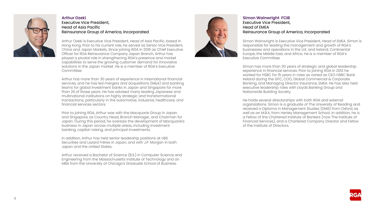 Arthur Ozeki Simon Wainwright FCIB执行副总裁、执行副总裁、亚太区主管欧洲、中东和非洲地区负责人美国再保险集团、Incorporated TERMA,Incorporated Arthur Ozeki为执行副总裁,亚太区主管,常驻Simon Wainwright为执行副总裁、欧洲、中东和非洲地区主管。西蒙是香港人。在担任现职之前,他曾担任高级副总裁,负责领导RGA中国和日本市场的管理和增长。自2016年加入RGA,担任英国和爱尔兰业务和运营首席执行官、RGA再保险公司日本分公司大陆干事以来,亚瑟业务遍及欧洲、中东和非洲。他是RGA的成员之一,该公司在加强RGA的存在和市场执行委员会方面发挥了关键作用。能力,以服务于日本市场上客户对创新解决方案日益增长的需求。他是RGA的执行官Simon的成员,拥有30多年的战略和全球领导委员会经验。金融服务经验。在2012年加入RGA之前,他曾在汇丰银行工作了15年,担任过各种不同的首席执行官,汇丰银行Arthur在担任全球金融危机、首席运营官、全球商业和企业服务期间拥有超过30年的国际金融爱尔兰经验,他曾领导并购(M & A)和银行业务,并担任欧洲、中东和非洲地区保险业董事总经理。他还曾在日本和新加坡的全球投资银行担任团队,在劳埃德银行担任更多的行政领导职务,以及其中的20多年。他曾为许多日本和全国领先的建筑协会。跨国机构就高度战略性和变革性交易提供咨询,特别是在汽车、工业、医疗保健领域,并在RGA和外部金融服务部门担任多个董事职务。Simon毕业于雷丁大学,并获得了牛津大学管理学研究(DMS)文凭,因为在加入RGA之前,Arthur曾在日本麦格理集团任职,并获得了亨利管理学院的工商管理硕士学位。此外,他还和新加坡一起,担任国家主管、分行经理和英国特许银行家协会(现为日本协会)研究员的主席。在此期间,他监督了麦格理金融服务(Macquarie’s Financial Services)的发展,并在日本担任了多个领域的特许公司董事和研究员业务,包括董事协会的投资、银行业务、融资和本金投资。此外,亚瑟还曾在瑞银证券和日本的Lazard Fr è res担任高级领导职务,并在日本和美国的摩根大通担任高级领导职务。Arthur获得了麻省理工学院计算机科学与工程学理学学士学位(B.S.)和芝加哥大学商学院MBA学位。8