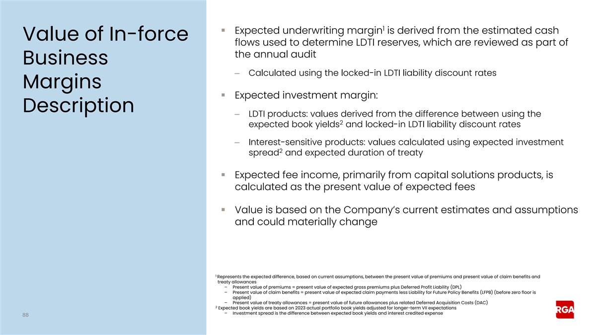 1 ▪预期承保利润率来自于用于确定LDTI准备金的有效流量的估计现金价值,这些现金价值作为年度审计业务的一部分进行审查–使用锁定的LDTI负债贴现率利润率计算▪预期投资利润率:说明– LDTI产品:由使用2个预期账面收益率和锁定的LDTI负债贴现率之间的差异得出的价值–利息敏感产品:使用预期投资2利差和预期条约期限计算的价值▪预期费用收入,主要来自资本解决方案产品,按预期费用现值计算▪价值基于公司当前的估计和假设并可能发生重大变化1表示预期差异,基于当前的假设,保费现值与理赔给付现值之间和条约备付金–保费现值=预期毛保费现值加上递延利润负债(DPL)–索赔利益现值=预期索赔付款的现值减去未来保单利益负债(LFPB)(适用零下限前)–条约备付金现值=未来备付金现值加上相关递延购置成本(DAC)2预期账面收益率基于2023年实际投资组合账面收益率根据较长期VII预期调整–投资价差是预期账面收益率和利息贷记费用之间的差额88