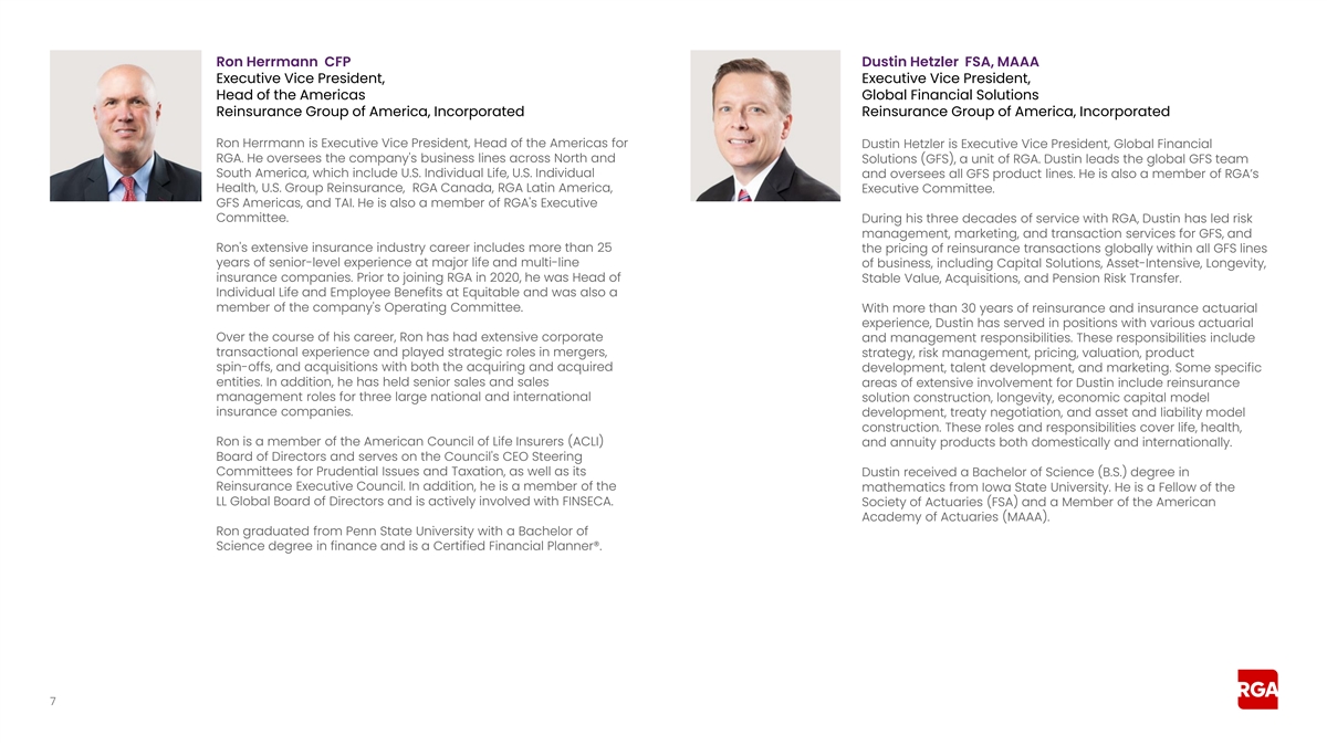 Ron Herrmann CFP Dustin Hetzler FSA,MAAA执行副总裁、执行副总裁、美洲全球金融解决方案负责人美国再保险集团、Incorporated 美国再保险集团、Incorporated Ron Herrmann为执行副总裁,Dustin Hetzler为美洲负责人,为全球金融执行副总裁RGA。他负责监督公司在North和Solutions(GFS)的业务线,这是RGA的一个部门。达斯汀领衔全球GFS团队南美洲,该团队包括美国个人人寿、美国个人并监督所有GFS产品线。他还是RGA健康、U.S. Group Reinsurance、RGA加拿大、RGA拉丁美洲执行委员会成员。GFS Americas和TAI。他也是RGA执行委员会的成员。在为RGA服务的三十年中,Dustin领导了GFS的风险管理、营销和交易服务,Ron拥有广泛的保险行业职业生涯,其中包括在全球所有GFS线内的再保险交易定价领域拥有超过25年的主要人寿和多线业务的高级经验,包括资本解决方案、资产密集型、长寿、保险公司。在2020年加入RGA之前,他曾担任稳定价值、收购、养老风险转移主管。Equitable的个人人寿和员工福利,也是该公司运营委员会的成员。凭借30多年的再保险和保险精算经验,Dustin曾在多个精算岗位任职在他的职业生涯中,Ron承担了广泛的公司和管理职责。这些职责包括交易经验,并在并购、战略、风险管理、定价、估值、产品分拆、收购中发挥战略作用,同时兼顾并购发展、人才发展和市场营销。一些特定实体。此外,他还担任过达斯汀高级销售和广泛参与的销售领域,包括三家大型国家和国际解决方案建设、长寿、经济资本模式保险公司的再保险管理角色。开发、条约谈判、资产负债模式建设。这些角色和职责涵盖人寿、健康,罗恩是美国人寿保险公司理事会(ACLI)和国内和国际年金产品的成员。董事会成员,并在该委员会的首席执行官审慎问题和税务指导委员会任职,其Dustin获得了再保险执行委员会的理学学士学位(B.S.)。此外,他还是爱荷华州立大学数学系的一员。他是LL全球董事会成员,并积极参与FINSECA。精算师协会(FSA)和美国精算师学会(MAAA)成员。Ron毕业于宾夕法尼亚州立大学,获得金融学理学学士学位,是一名注册财务规划师®。7