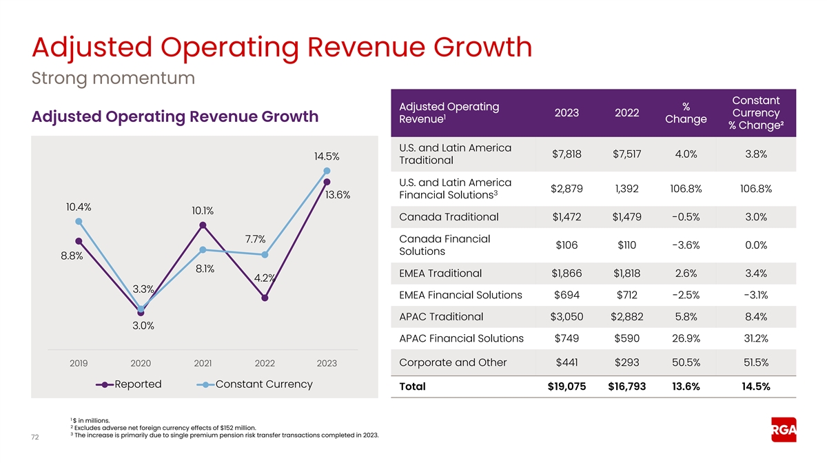 调整后营业收入增长强劲势头不变调整后营业收入百分比20232022货币1调整后营业收入增长收入变动%变化²美国和拉丁美洲$ 7,818 $ 7,5174.0% 3.8% 14.5%传统美国和拉丁美洲$ 2,8791,392106.8% 106.8% 313.6%金融解决方案10.4% 10.1%加拿大传统$ 1,472 $ 1,479-0.5 % 3.0% 7.7%加拿大金融$ 106 $ 110-3.6 % 0.0%解决方案8.8% 8.1% EMEA传统$ 1,866 $ 1,8182.6% 3.4% 4.2% 3.3% EMEA金融解决方案$ 694 $ 712-2.5 %-3.1 % APAC Traditional $ 3,050 $ 2,8825.8% 8.4% 3.0% APAC Financial Solutions $ 749 $ 59026.9% 31.2% Corporate和其他$ 441 $ 29350.5% 51.5% 201920202021202220222023报告的固定货币总额$ 19,075 $ 16,79313.6% 14.5% 1 $百万。2不包括1.52亿美元的不利外汇净影响。3这一增长主要是由于2023年完成的单一保费养老金风险转移交易。72