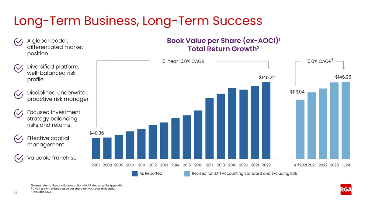 长期业务,长期成功1全球领先,每股账面价值(不含AOCI)分化市场2总回报增长地位315年10.0% CAGR 10.6%多元化平台,风险均衡$ 146.96 $ 146.22简介$ 113.04纪律严明的承销商,积极主动的风险管理人专注于平衡风险和回报的投资策略$ 40.36有效的资本管理有价值的特许经营权200720082009201020112012201320142015201620162017201820192020202120221/1/1/20212012022202220231Q24报告为LDTI会计准则修订,不包括B36 1请参阅附录中的“非公认会计原则措施的调节”。2每股账面价值(不含AOCI)加上股息的CAGR增长。3包括24年第一季度。75