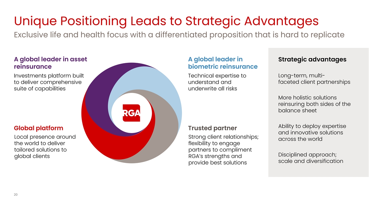 全球平台、当地存在、始终如一的文化RGA通过在全球25个市场的运营,将深刻的当地洞察力与全球视野相结合,服务于110多个国家的跨国和国内客户。美国和欧洲、中东和非洲加拿大亚太地区拉丁美洲1 PTAOI 42% 7% 19% 32%雇员2,150 + 400 + 550 + 800 +精算、核保和22% 36% 37% 44%医疗角色3业务能力# 1 # 1 # 2 # 12排名1不包括值得注意的项目,这代表精算假设变化对受LDTI约束的业务的影响。请参阅附录中的“Non-GAAP措施的调节”。不包括企业和其他部门。2 NMG咨询Global Life & Health Reinsurance Studies 2023,Business Capability Index(BCI)。173美国和墨西哥的排名(即合并)。